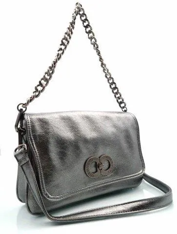 Bolso bandolera de tamaño mediano detalles metalicos en color plata. Cierra con cremallera. Bolsillo con cremallera en la parte trasera. Su asa es ajustable. Logo de la marca en la parte delantera metalizado.