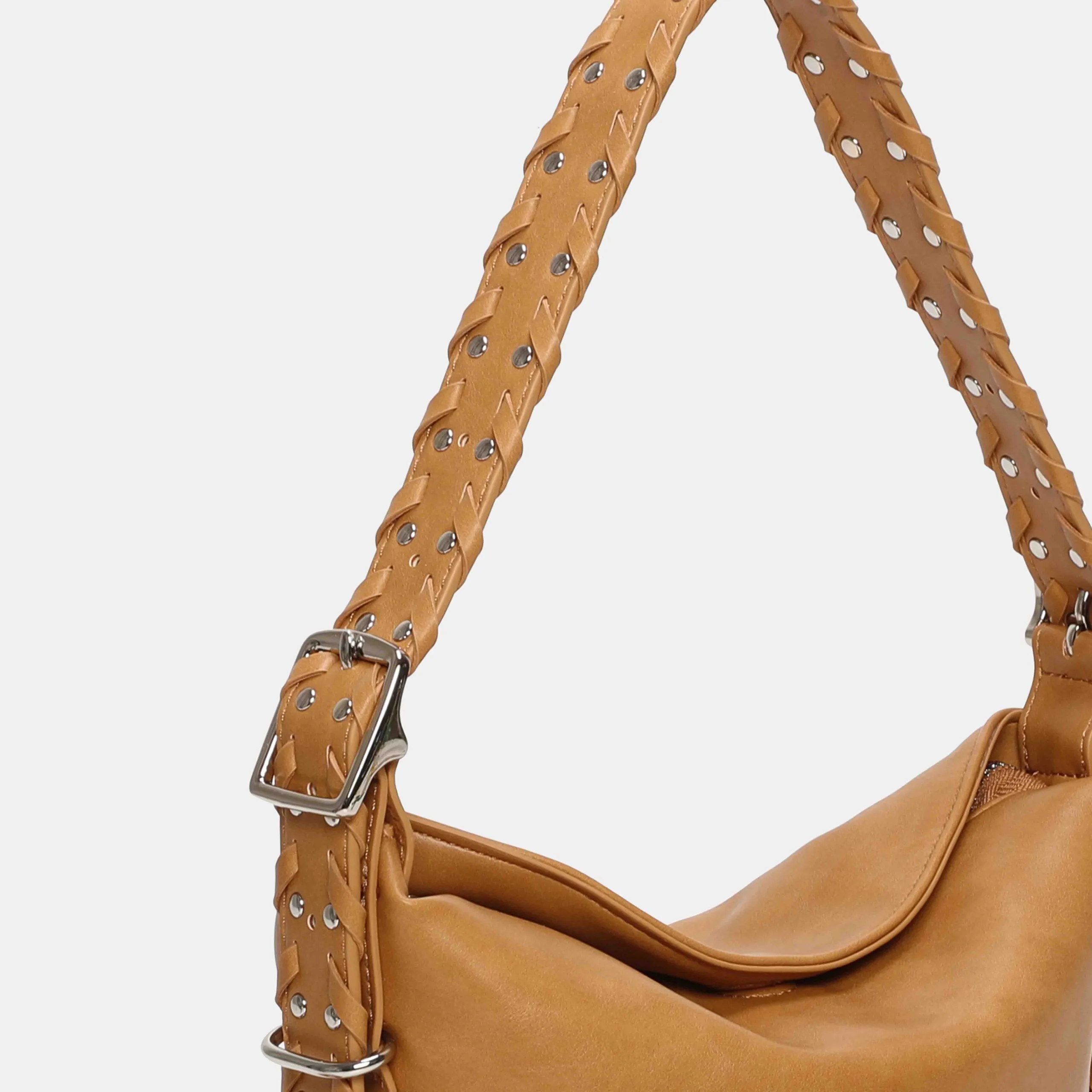 Bolso versátil y cómodo que lo podrás combinar con todos tus outfits veraniegos .Se accede a su interior por medio de una cremallera superior en la cual encontraras diferentes bolsillos en su interior, un o de ellos con cremallera. Podrás llevarlo además de hombro, como bandolera gracias al asa que lleva en su interior. Toda sus detalles matálicos son de color nickel.