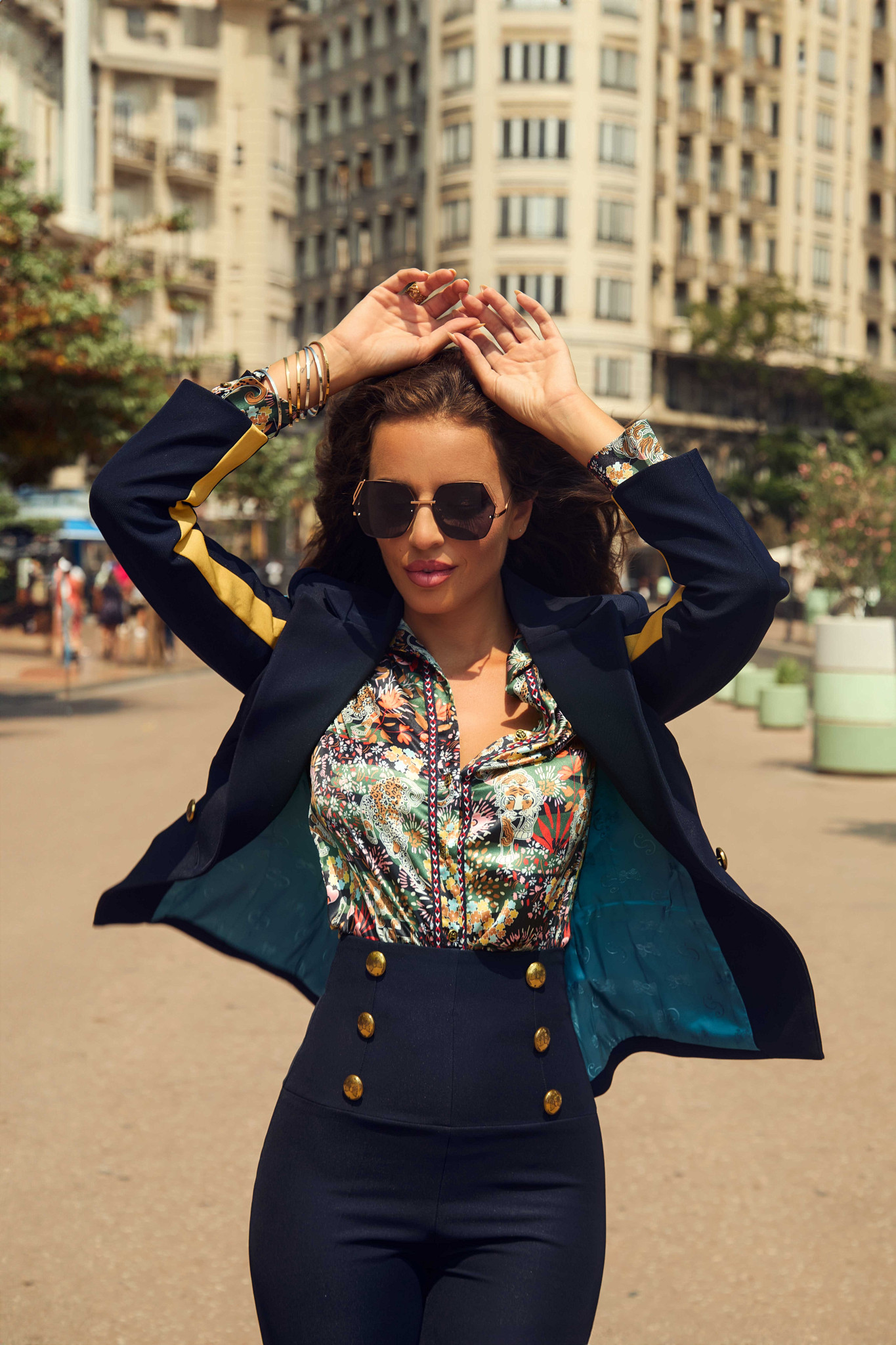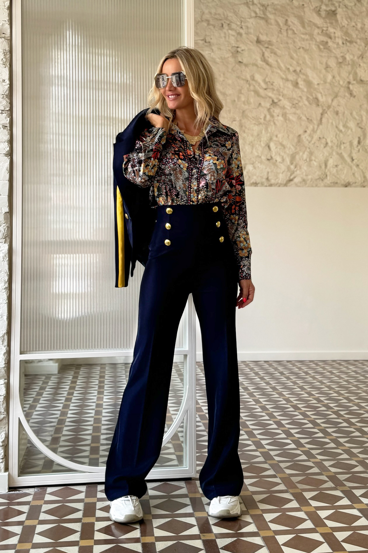 Blusa fluida de manga larga, con estampado de flores y fondo de color azul. Se cierra con botones personalizados en la parte delantera, y en los puños.