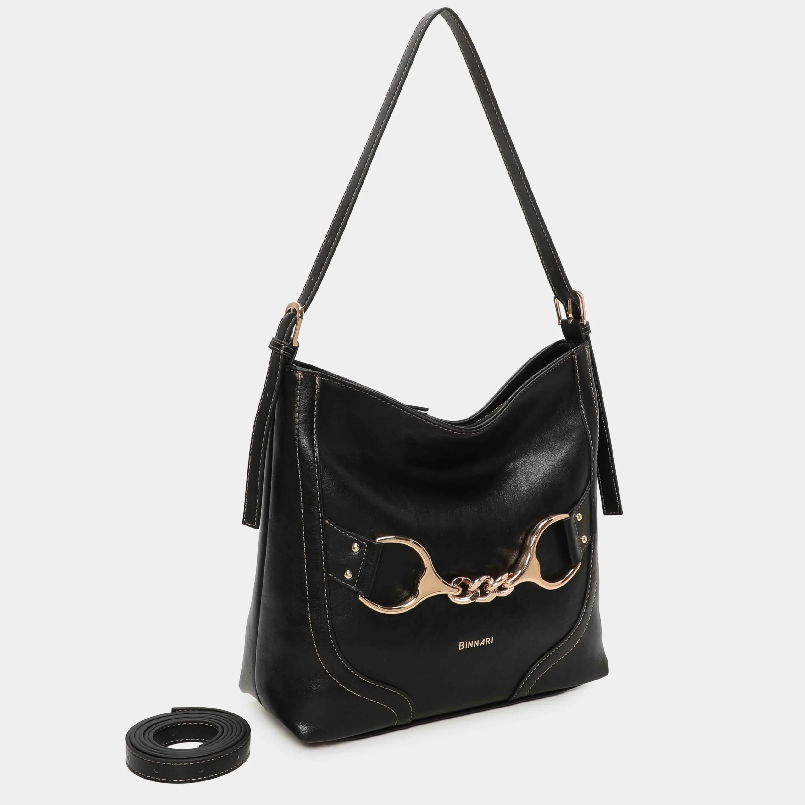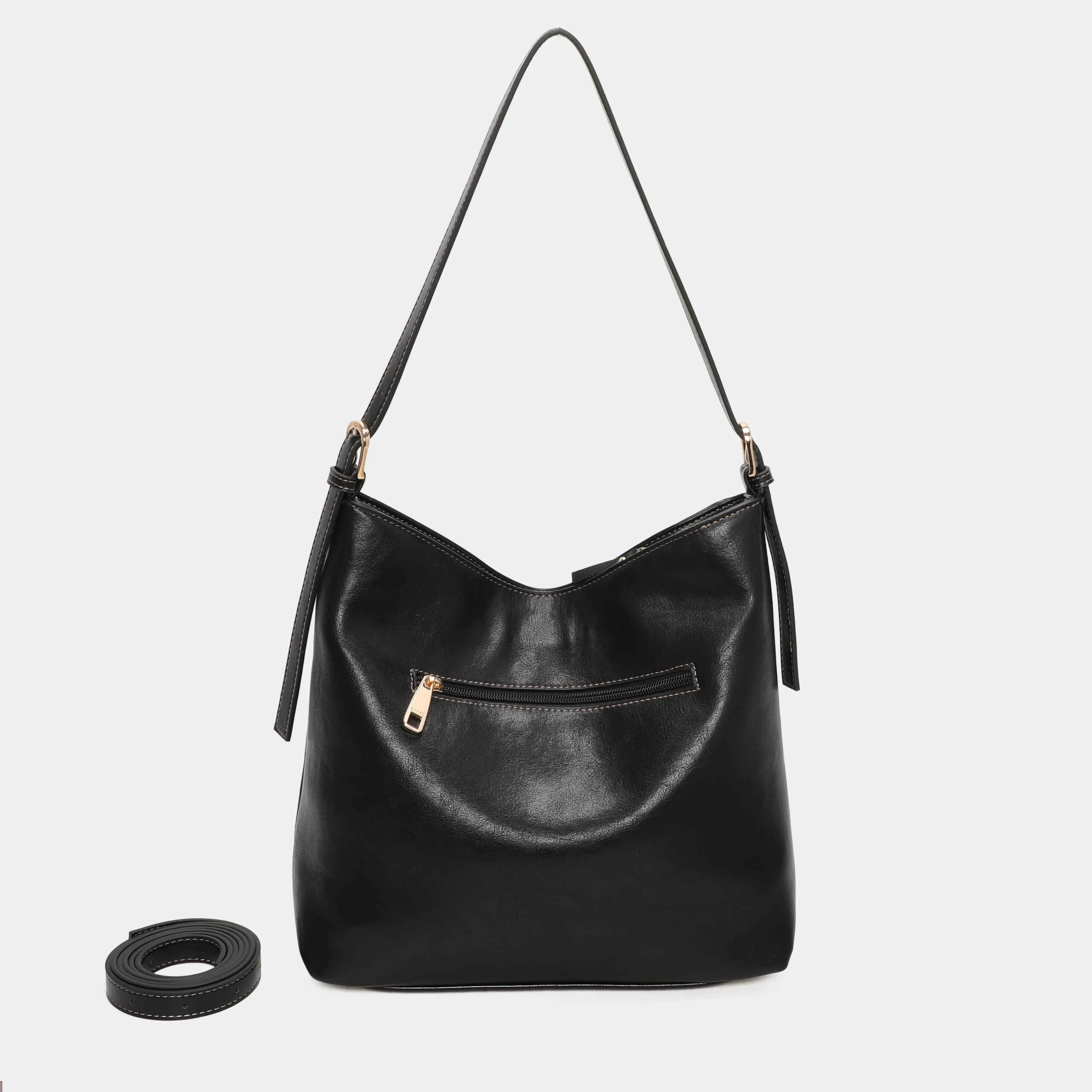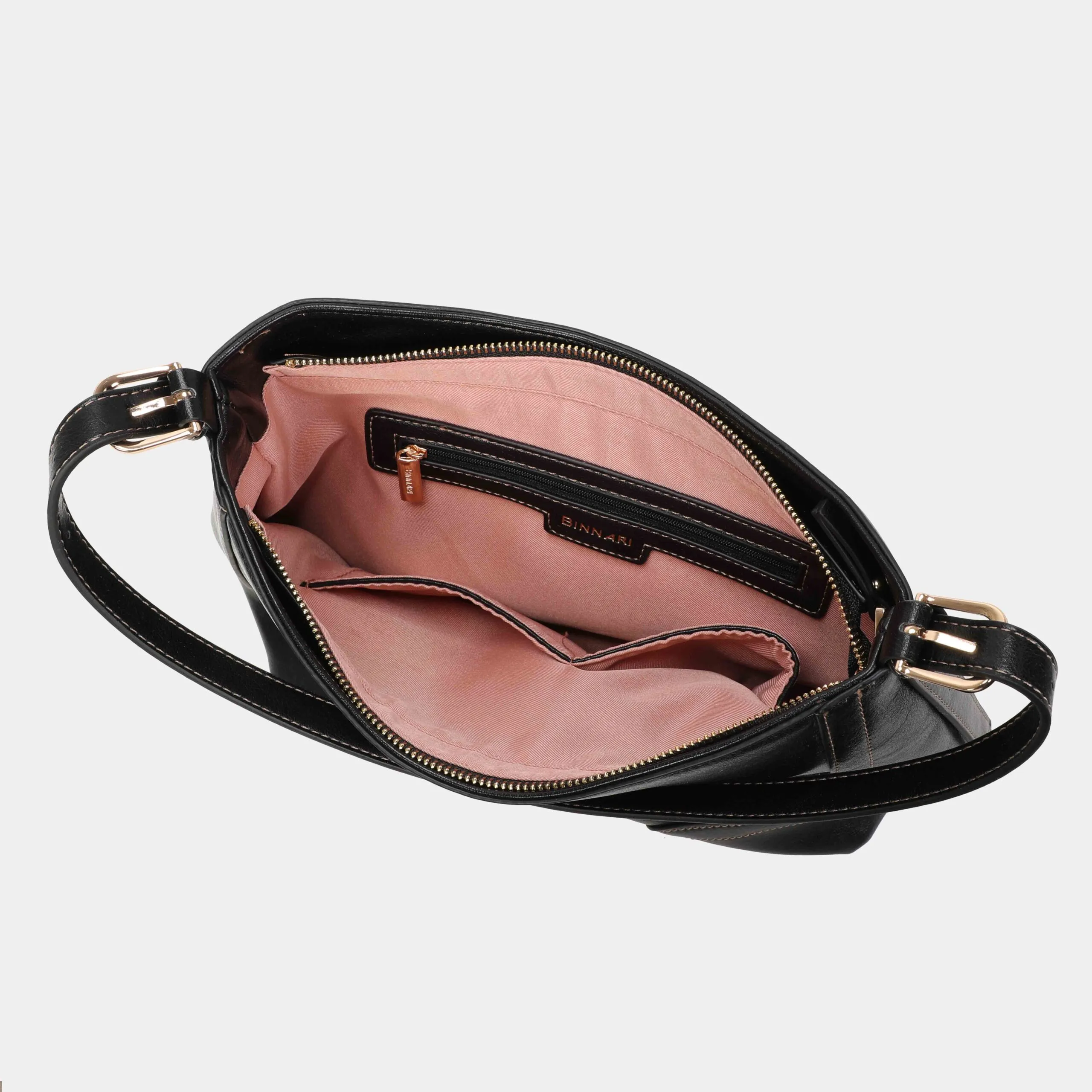 Bolso hombro o como bandolera gracias al asa ajustable que lleva en su interior. Se accede al interior por medio de una solapa. En el encontramos un bolsillo con cremallera. Detalles decorativos en color oro claro.