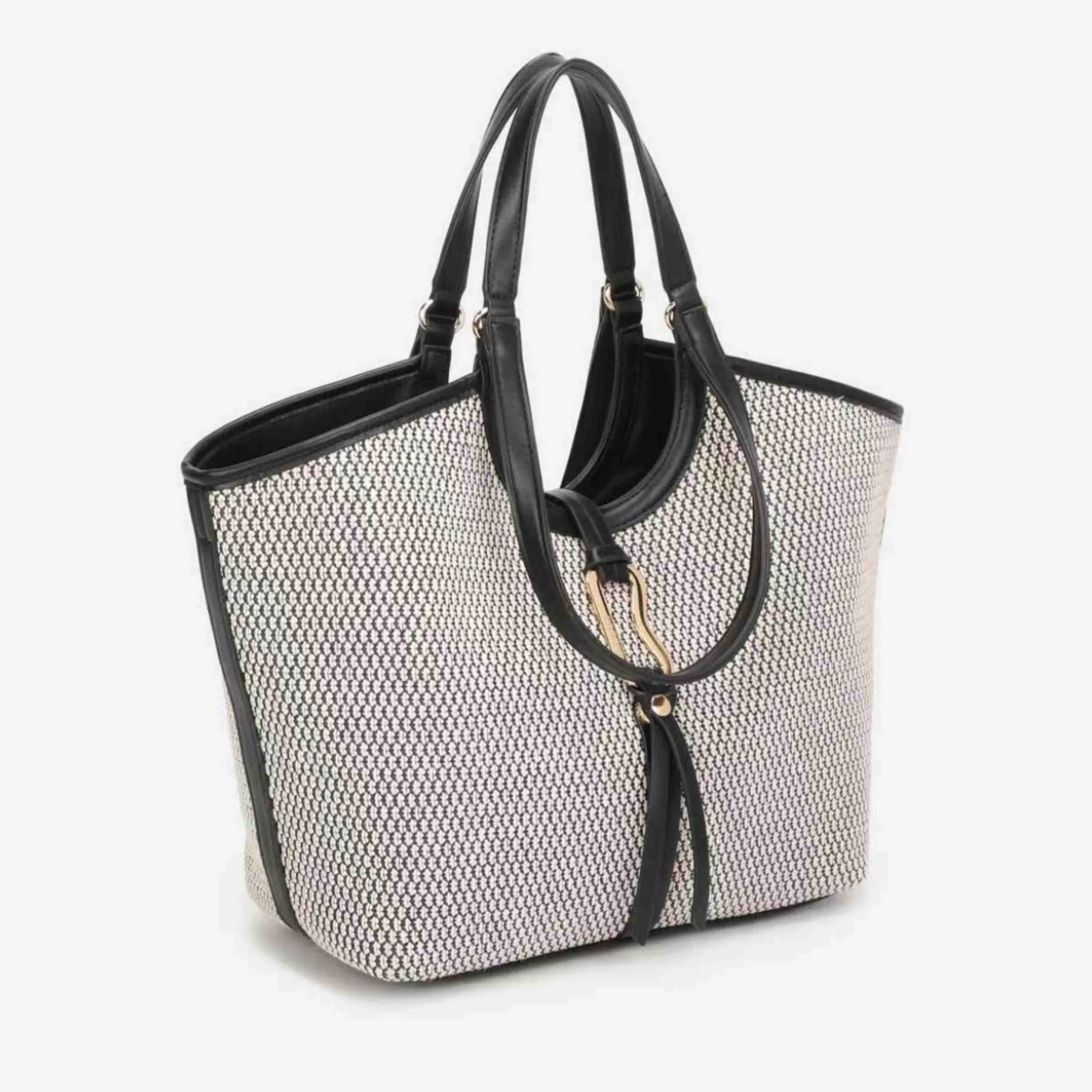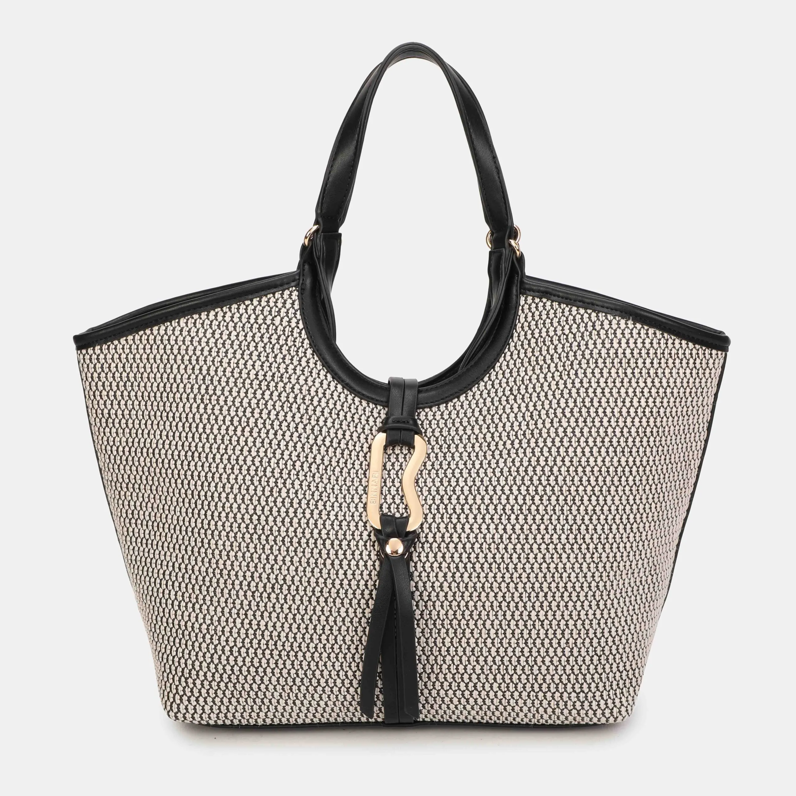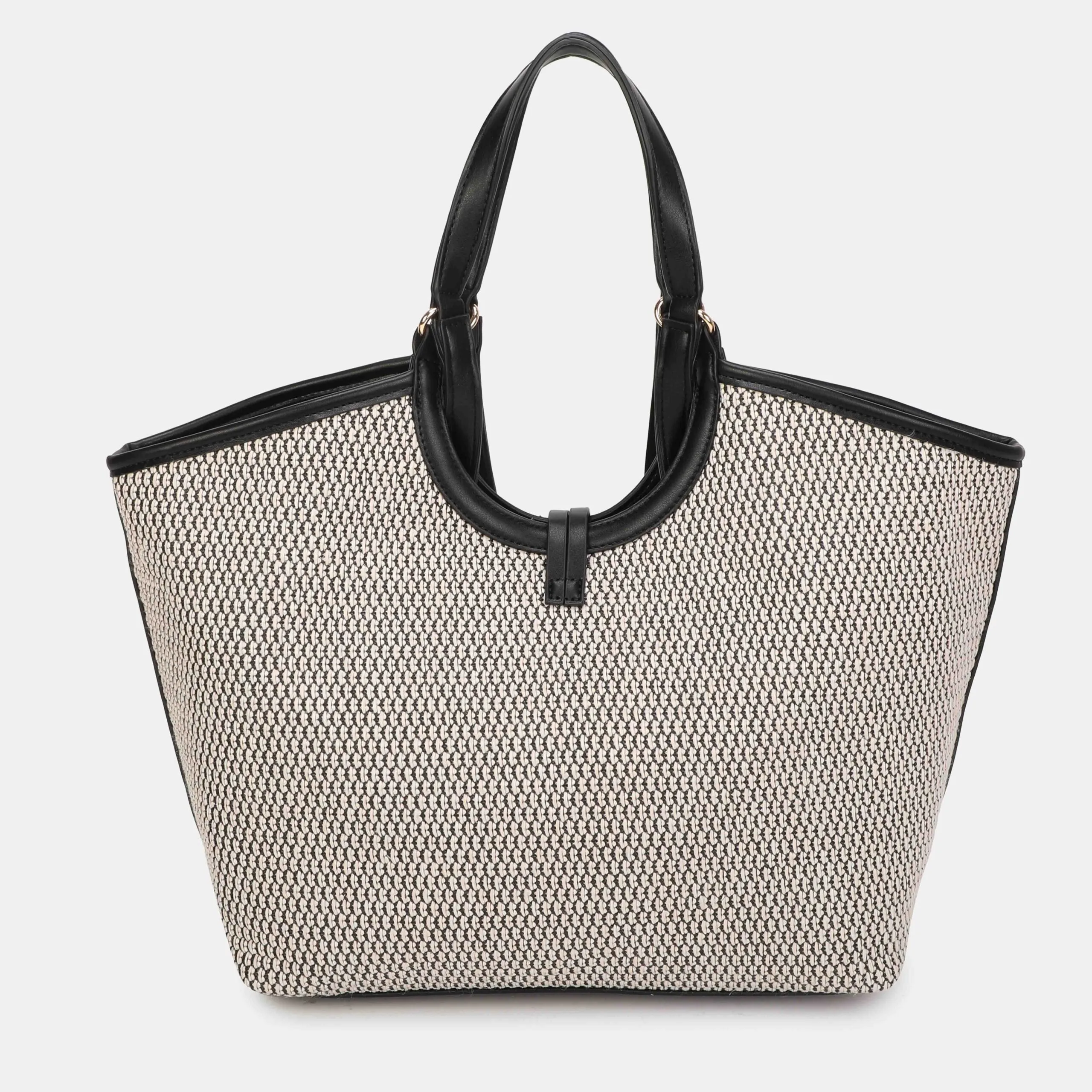 Esta versión XL del bolso  está confeccionada en rafia . Tiene dos posiciones; mano y bandolera, asa ajustable en su interior. Encontramos diferentes bolsillos, uno de ellos con cremallera. Los detalles metálicos son de color oro claro.