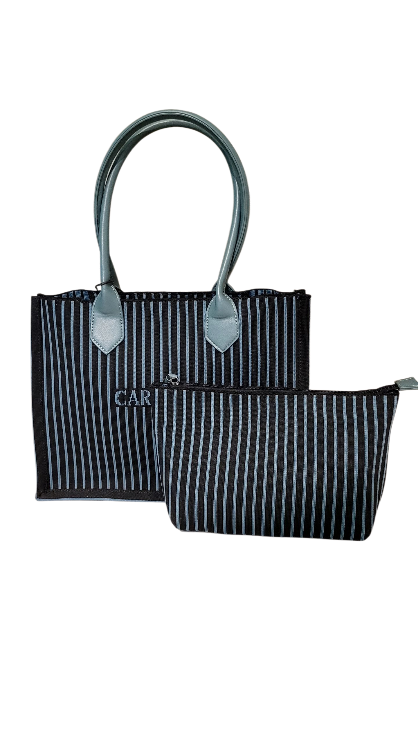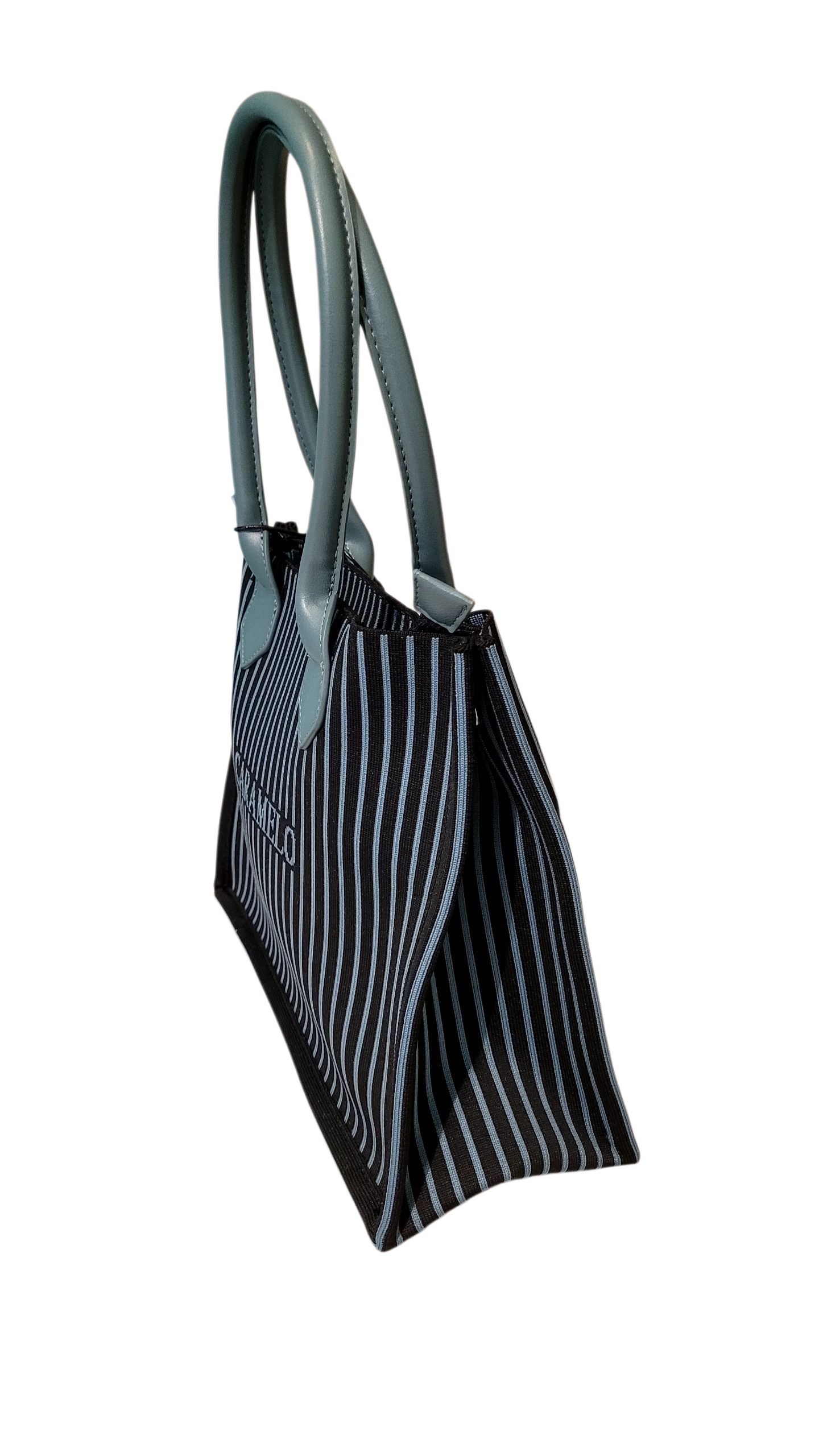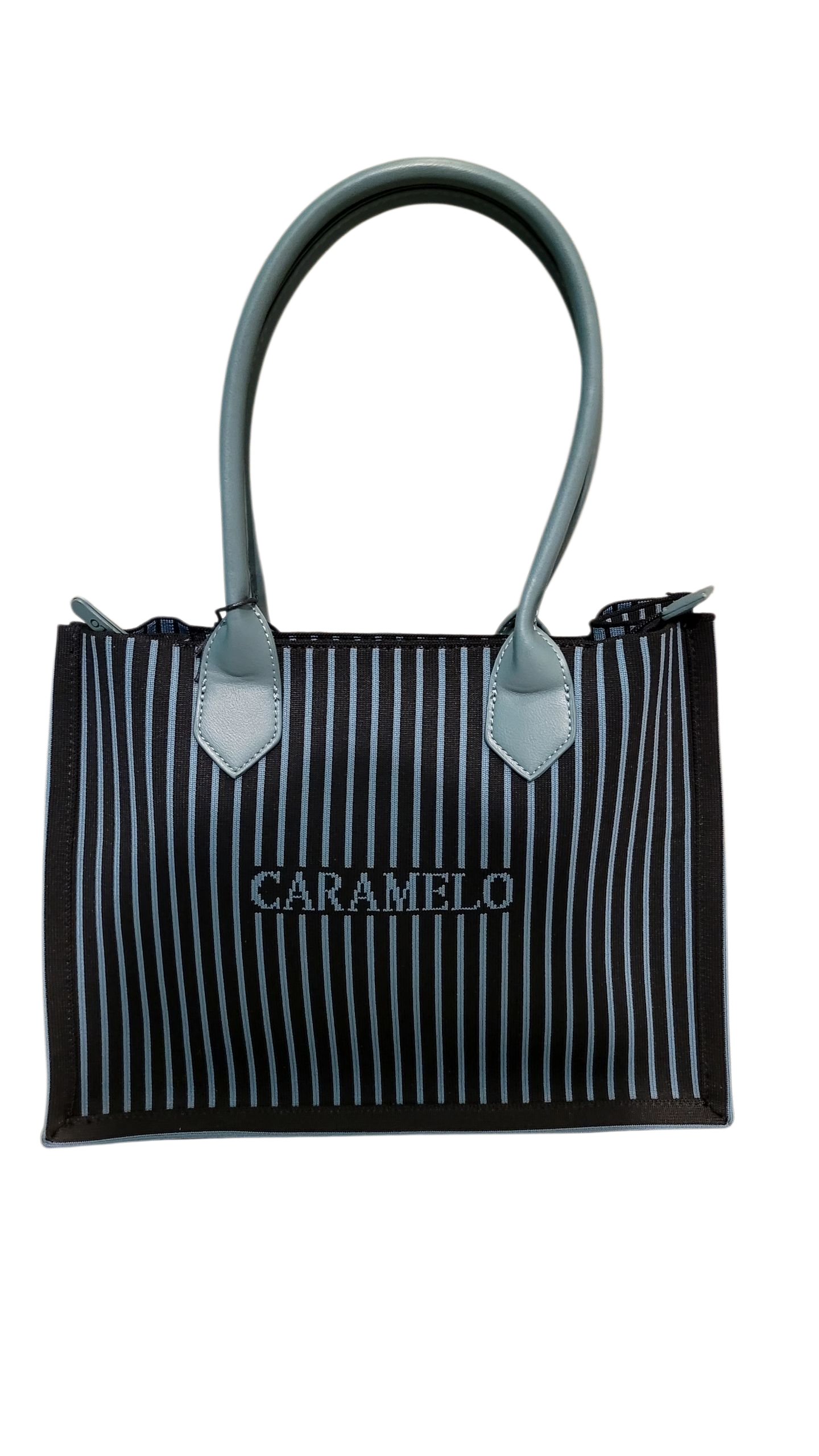Bolso Caramelo color negro de franjas en color verde. Cierre de cremallera y doble asa de hombro. Tiene un neceser a juego, de quita y pon, en el interior del bolso, con cierre de cremallera. En su frontal tiene el nombre de la marca impreso al tono. Bolso diseñado en España.