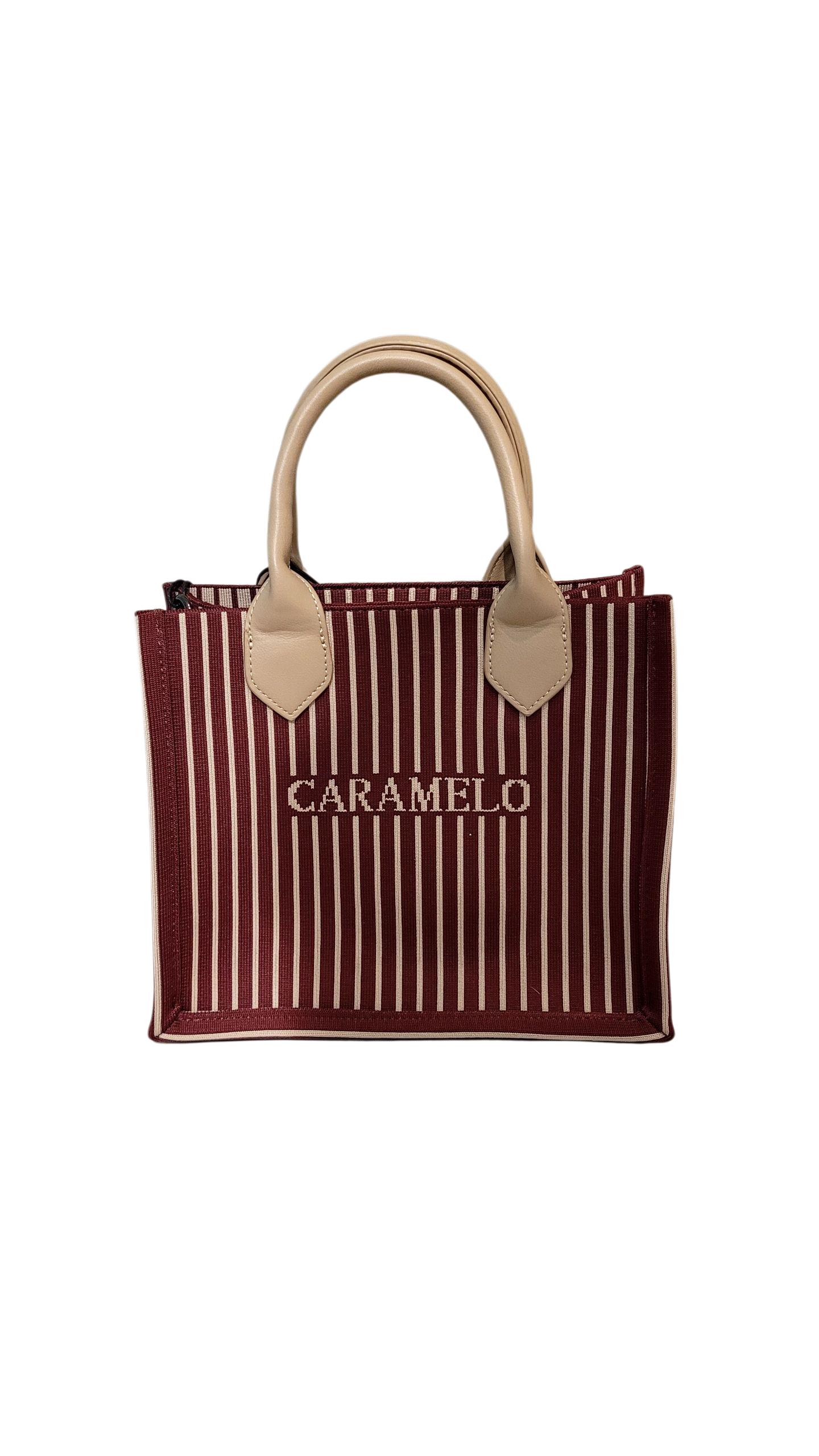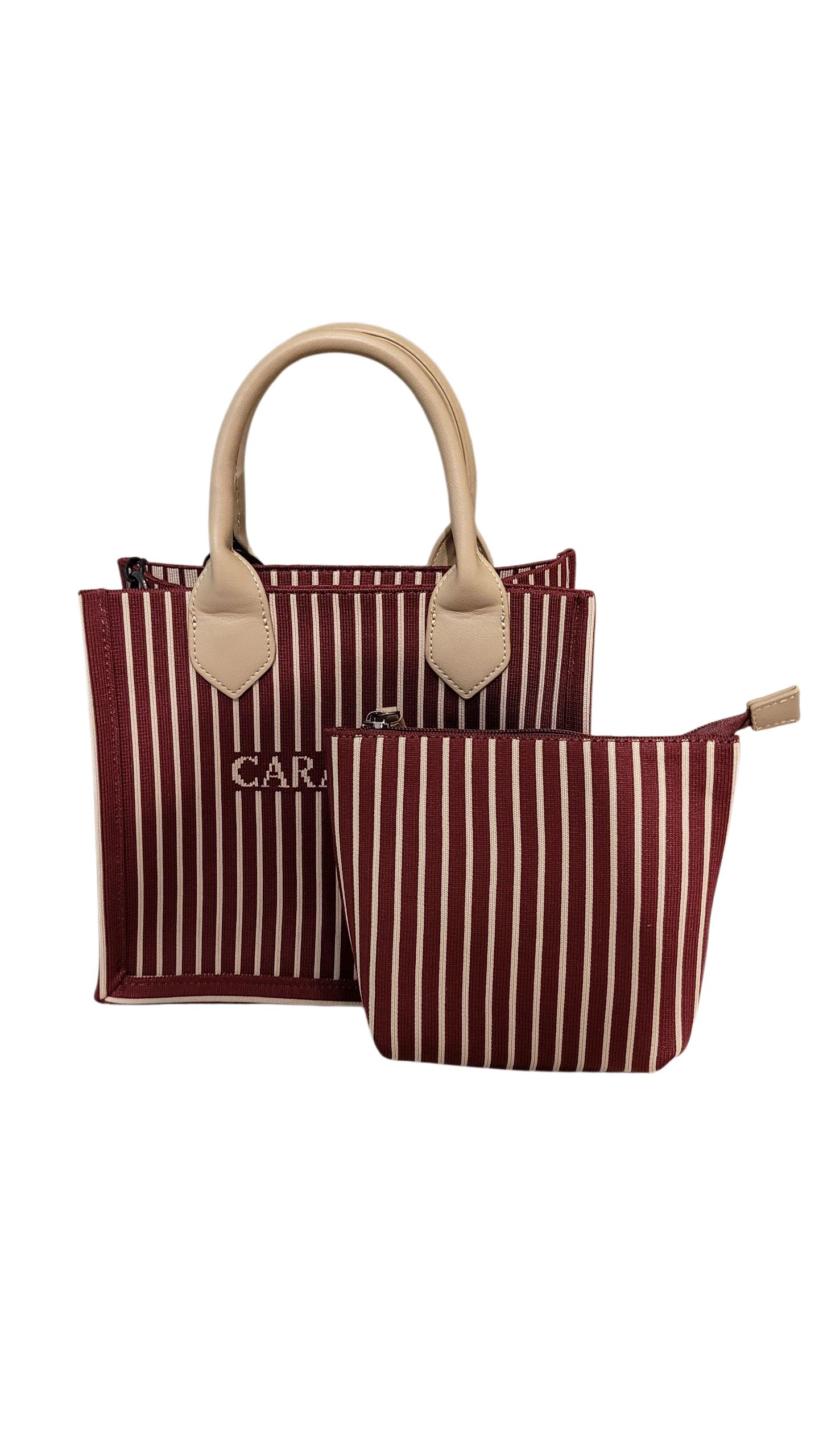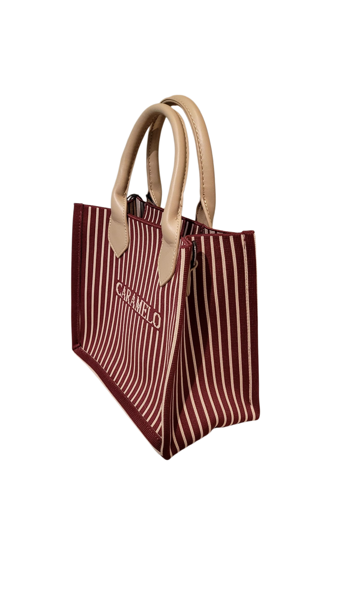 Bolso de rayas verticales , con dos asas, y bandolera adicional. Con neceser cambia-bolsos en el interior. Exterior e interior textil. Asas, bandolera y tiradores de piel.
