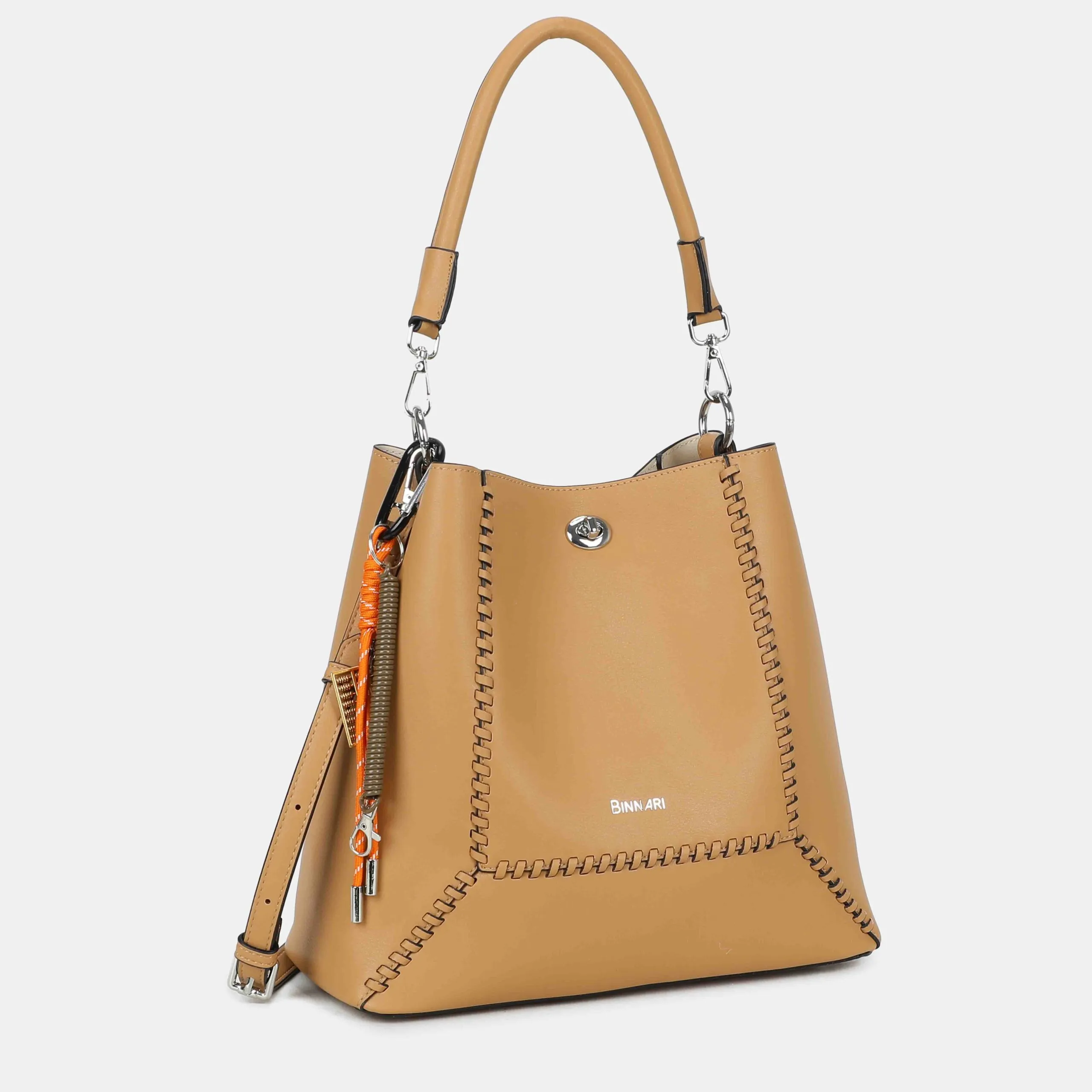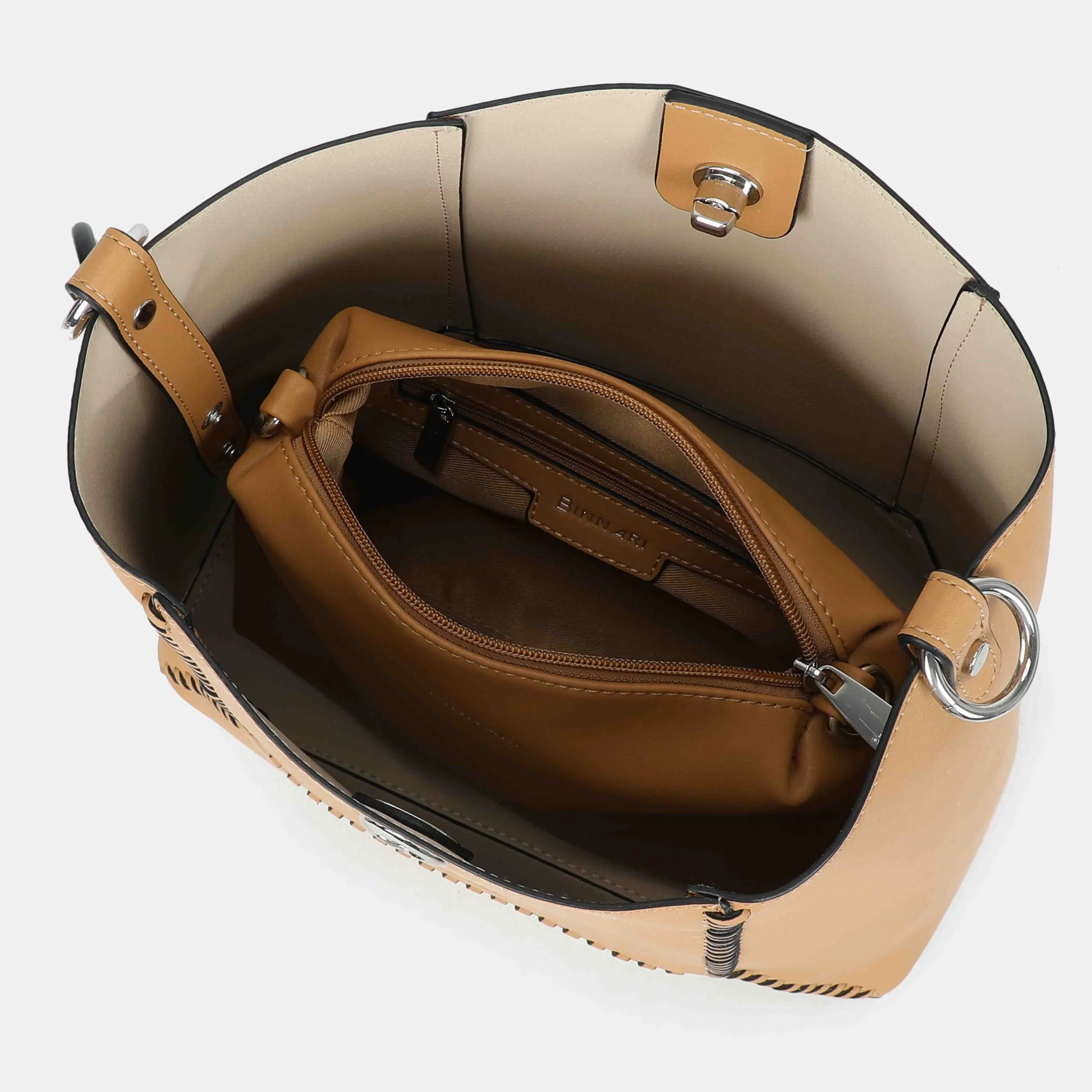 Perfecto para quienes buscan versatilidad, este modelo incluye dos bolsos en uno: en su interior lleva un neceser con asa ajustable que puede utilizarse como bandolera independiente. El diseño exterior luce un elegante detalle trenzado que enmarca toda la pieza y un colgante decorativo que aporta personalidad. Con asa al hombro y correa adicional, es un bolso práctico, estiloso y súper funcional para el día a día.