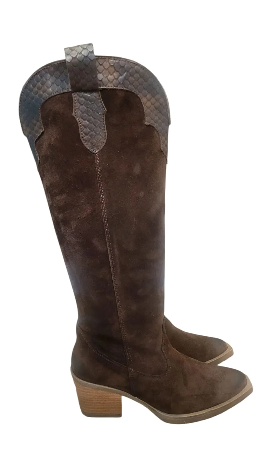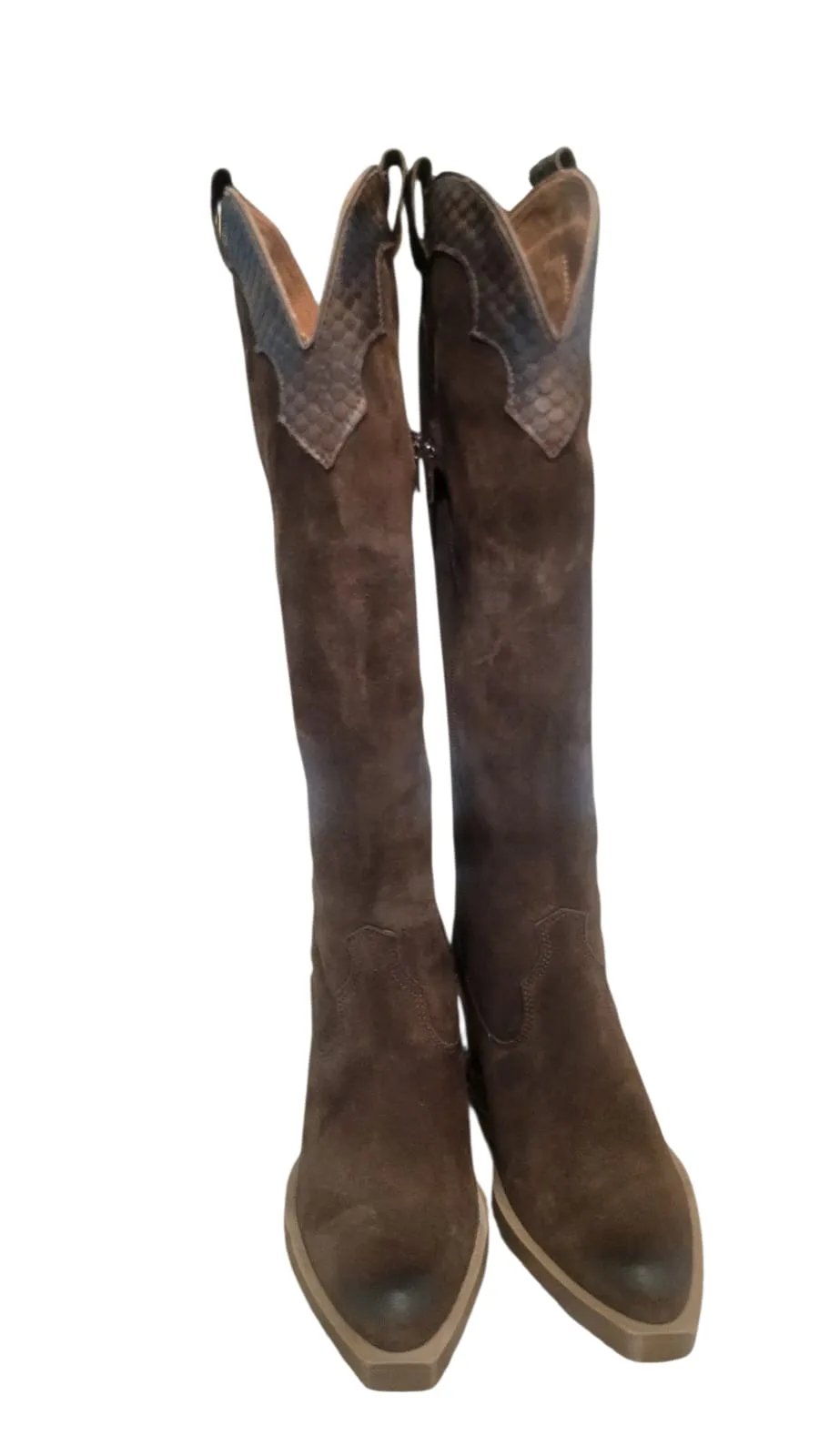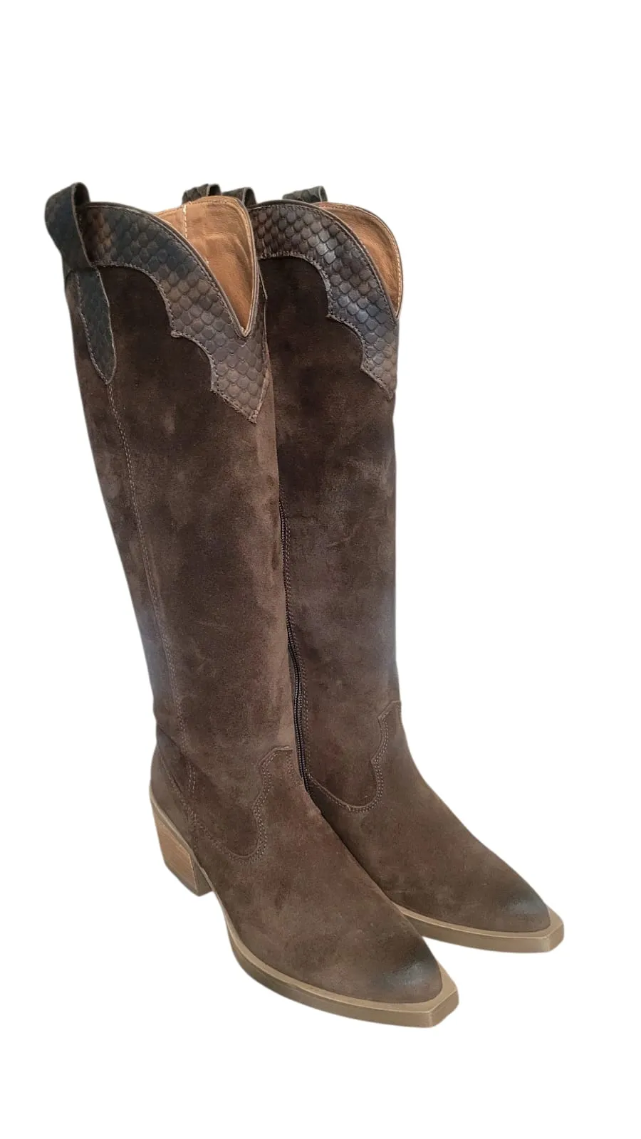 Bota campera wester combinada en suave ante marrón con piel de serpiente al tono. Cierre con cremallera lateral para facilitar el calce. Una bota fabricada en España por expertos maestro en la manufacturación de cuero natural. Abalorio metalico en el tacón , en acabado de bronce envejecido. Forro interior de piel y plantilla acolchada no extraible. Suela de goma. Altura de tacón 6,5 cm y altura de caña 46 cm.