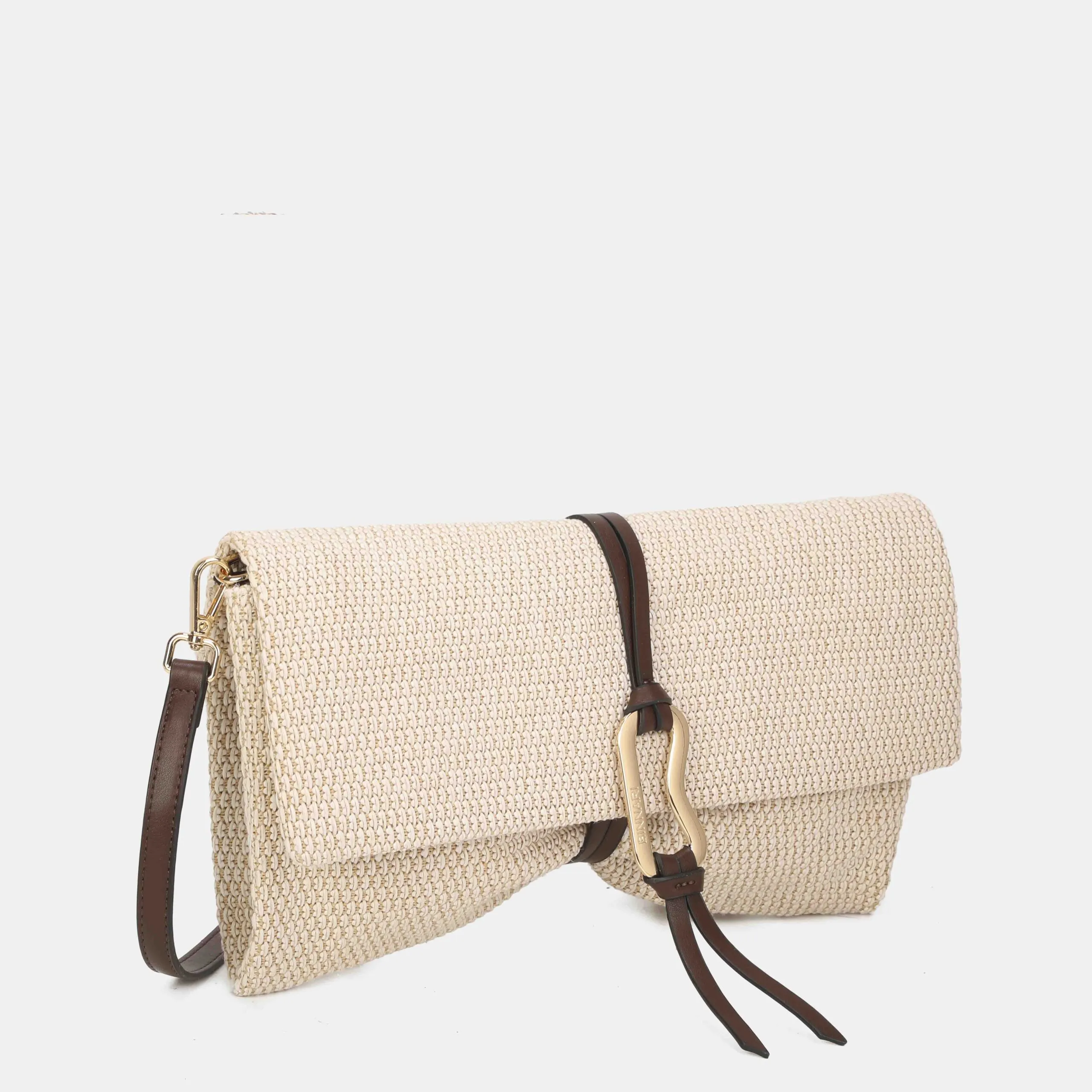 Cartera de mano tamaño mediano y confeccionada en rafia.  Puedes llevarla además de bandolera, ya que tiene un asa ajustable en su interior. Los detalles metálicos son de color oro claro.
