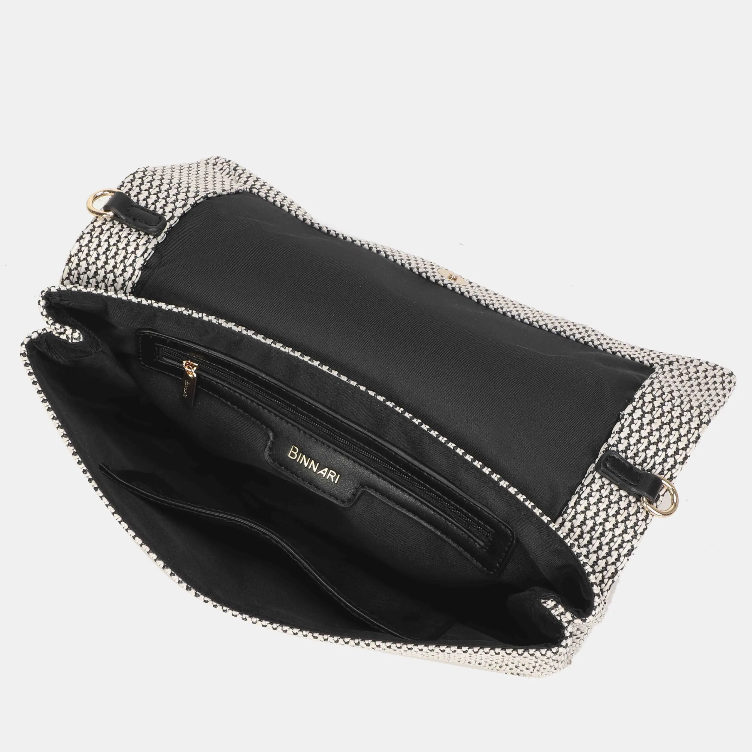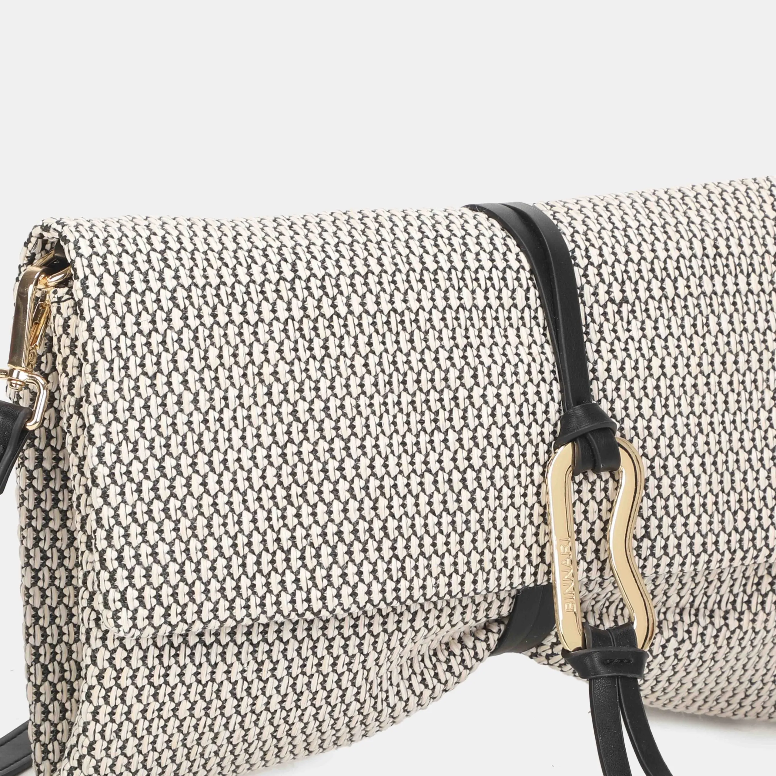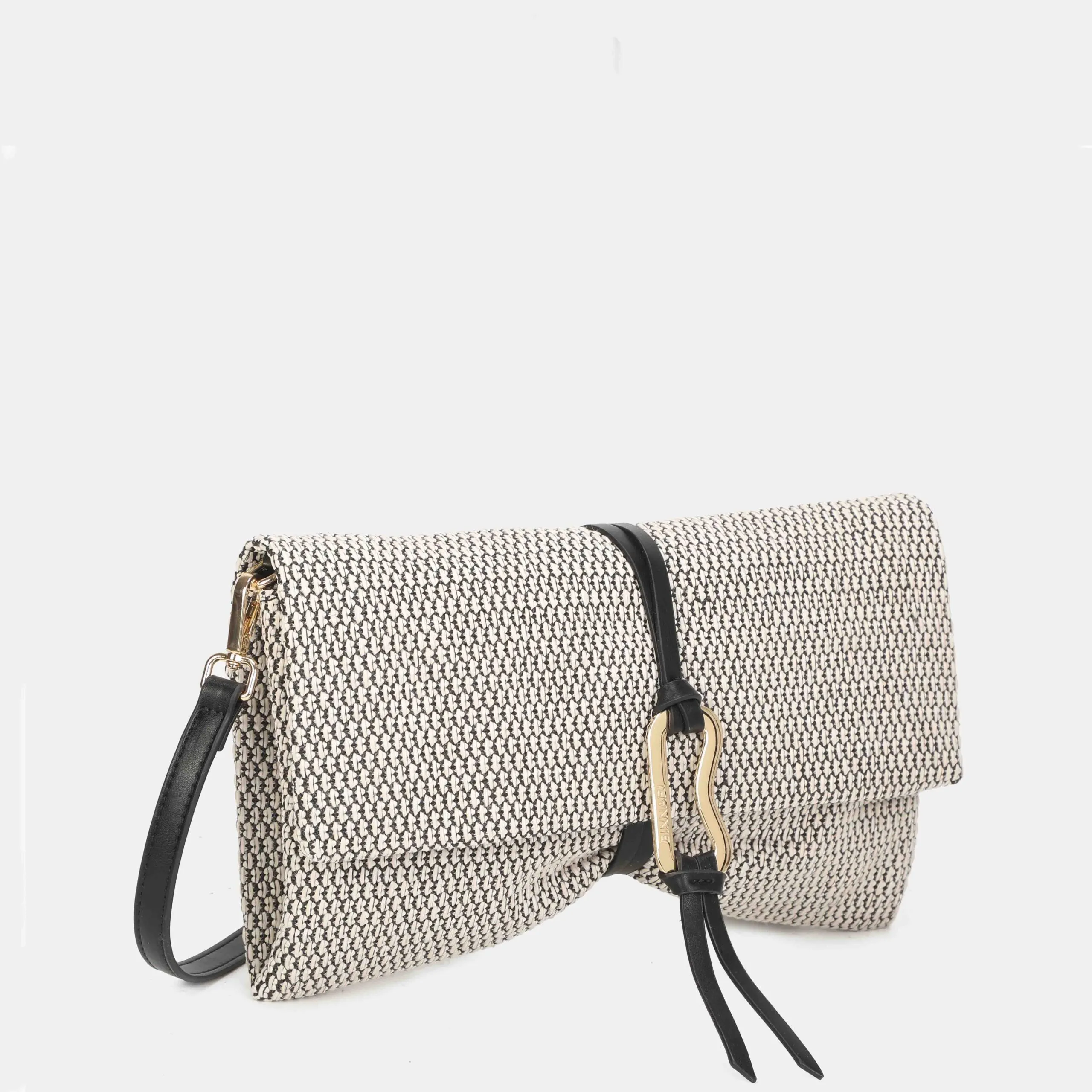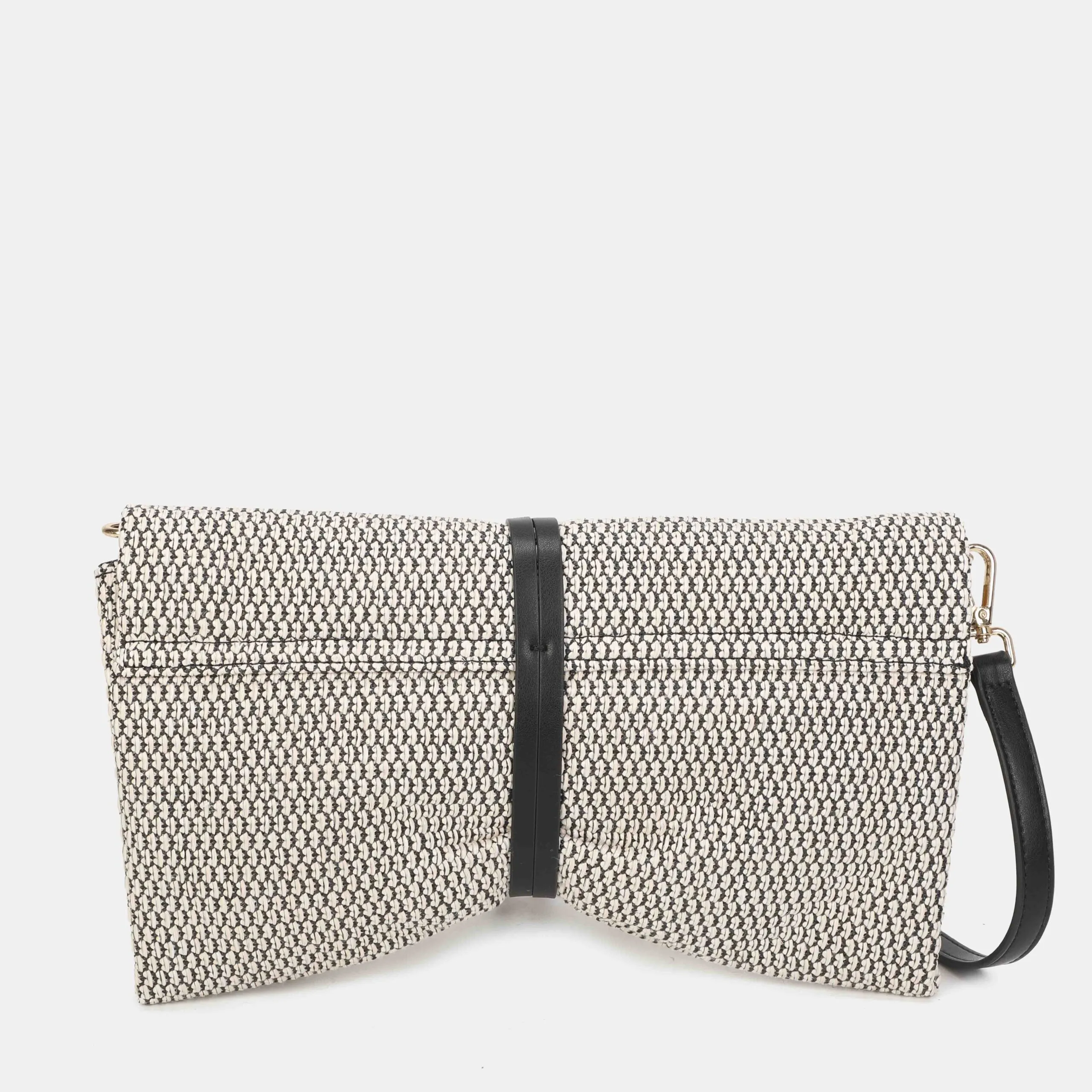 Cartera de mano tamaño mediano y confeccionada en rafia. Puedes llevarla además de bandolera, ya que tiene un asa ajustable en su interior. Los detalles metálicos son de color oro claro.