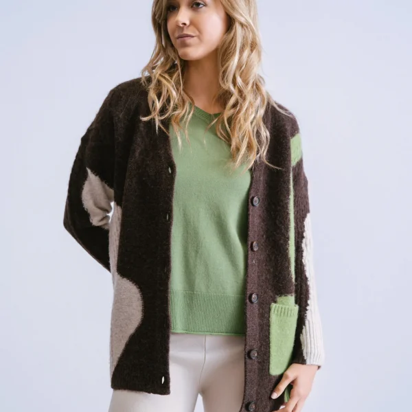 Chaleco marrón de pana con escote en pico, botones en la parte delantera, detalle de ribete en azul, y cadenita y bordado de Camaleónica en la parte de la espalda.
