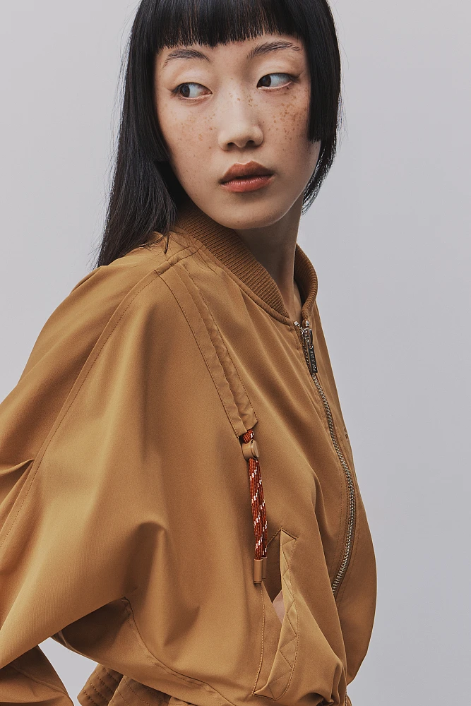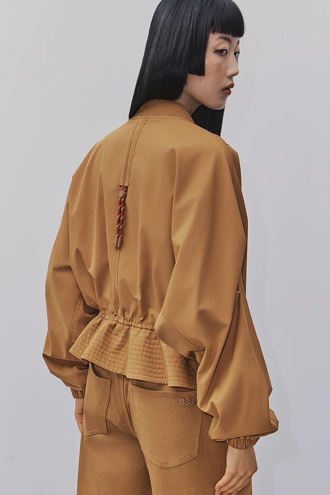 Chaqueta corta de manga larga, fruncida, cierre con cremallera, con bolsillos.