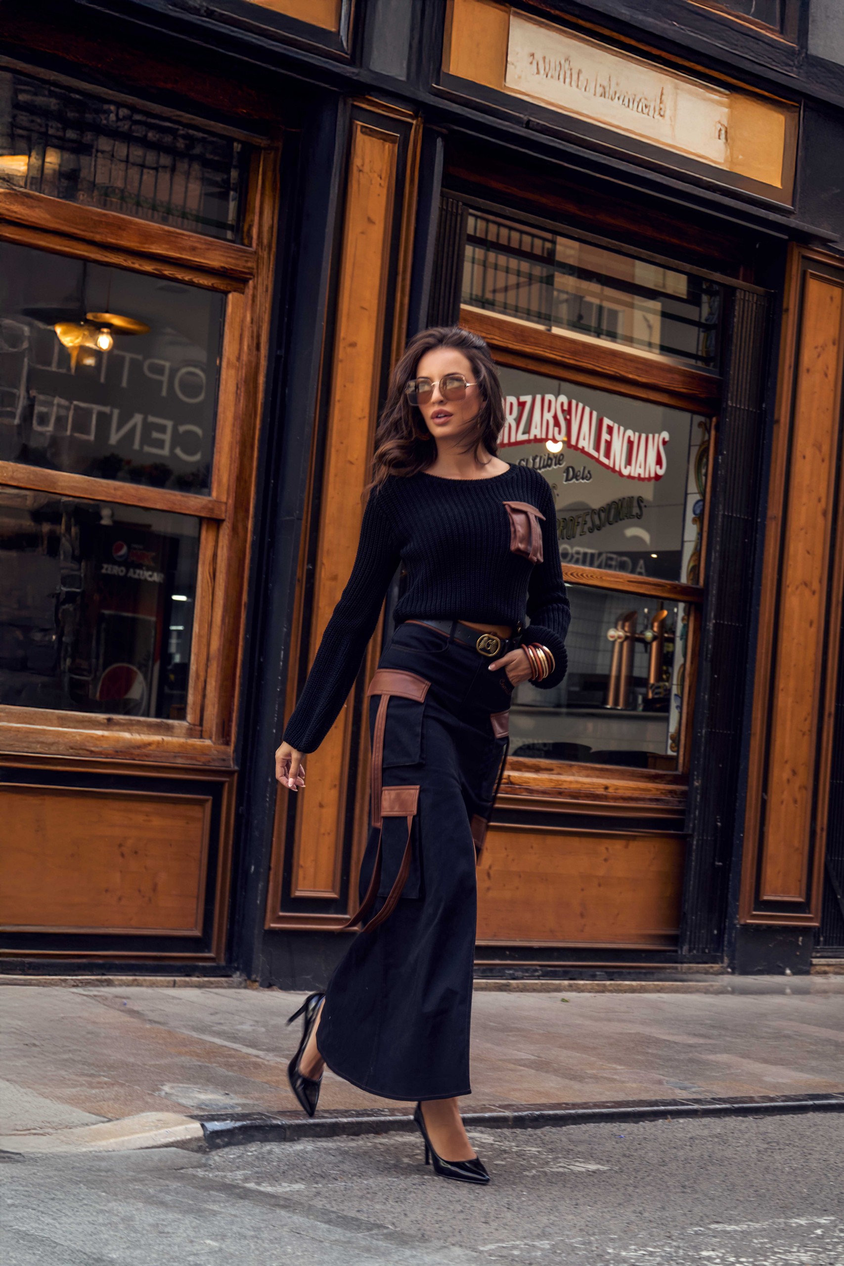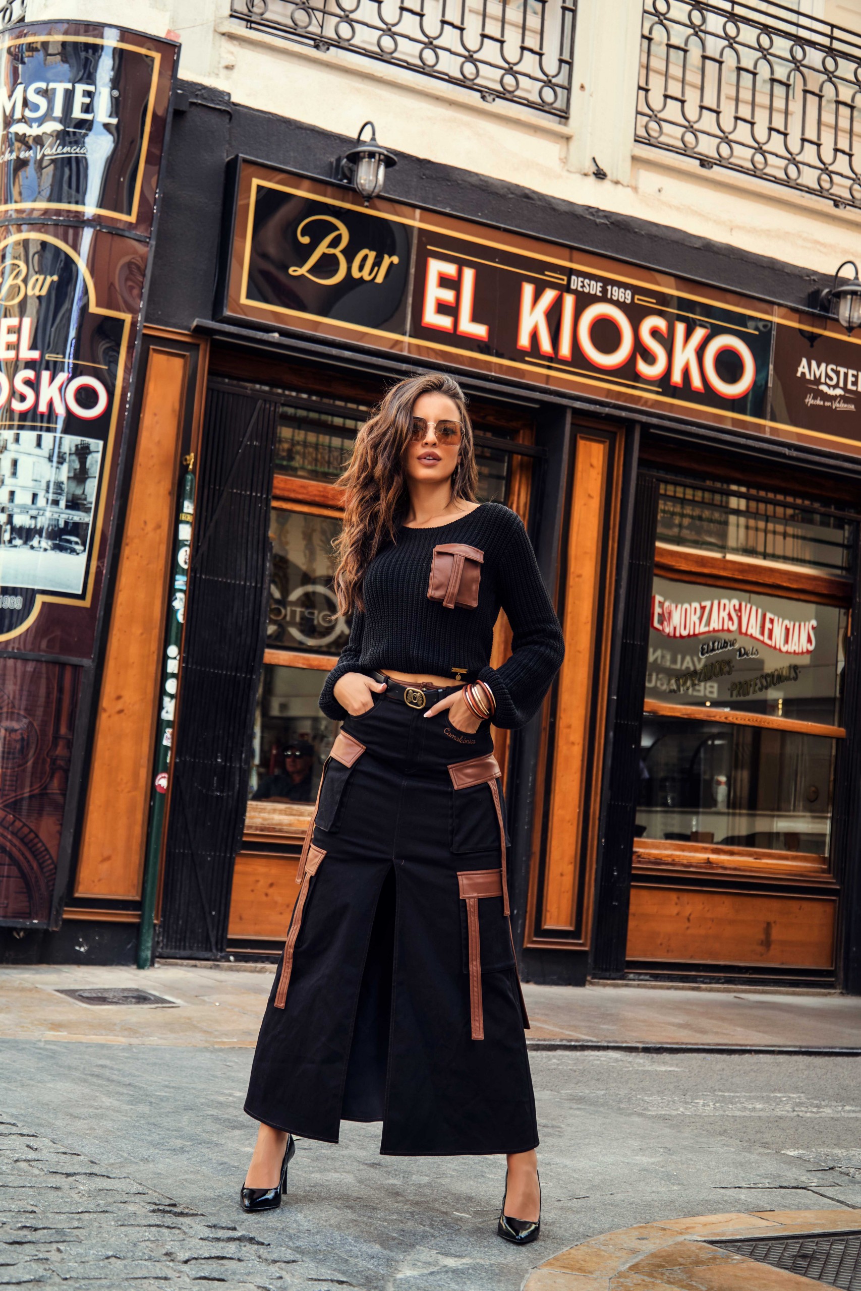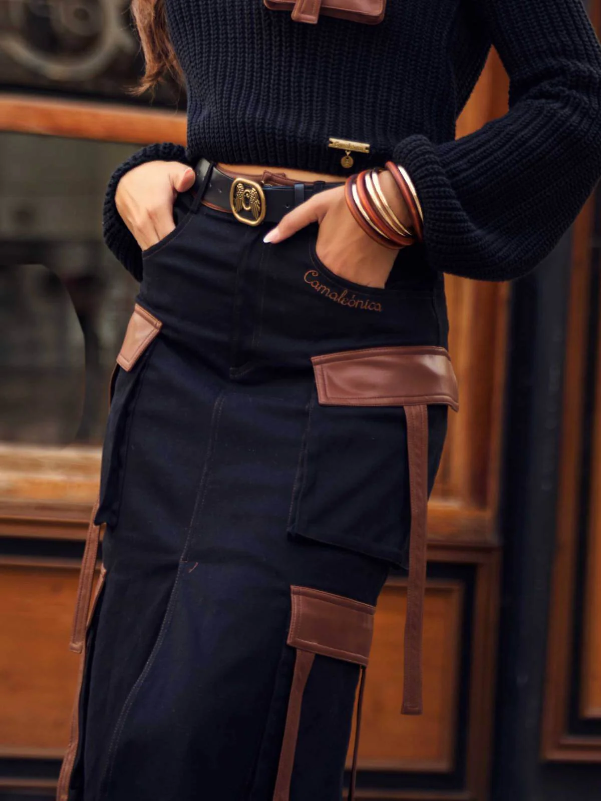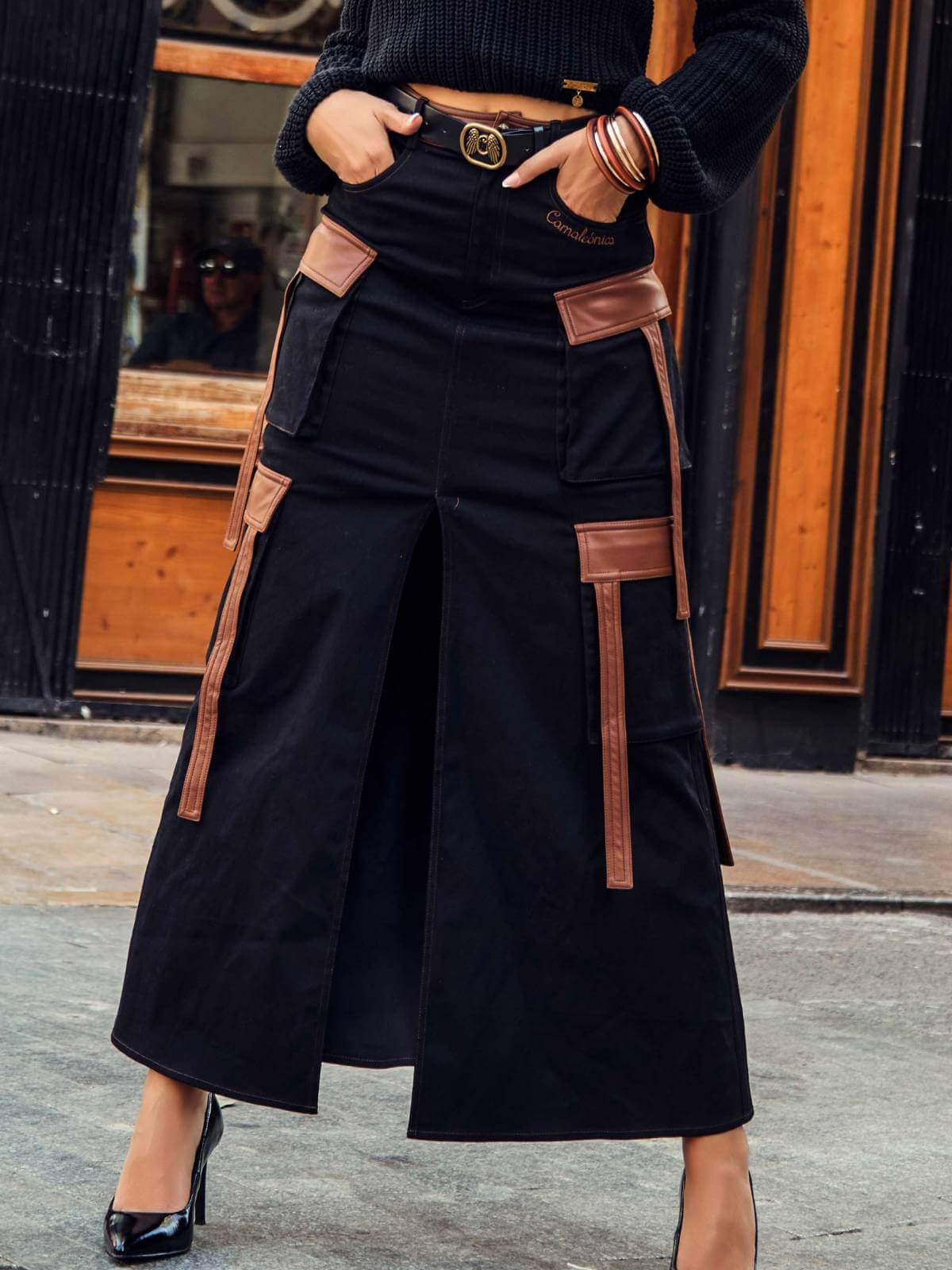 Falda larga vaquera negra estilo cargo con multibolsillos, con detalles en ecopiel en color marrón. Dos bolsillos laterales. Abertura central. Cinturilla marrón de ecopiel. Cierre con botón y cremallera.