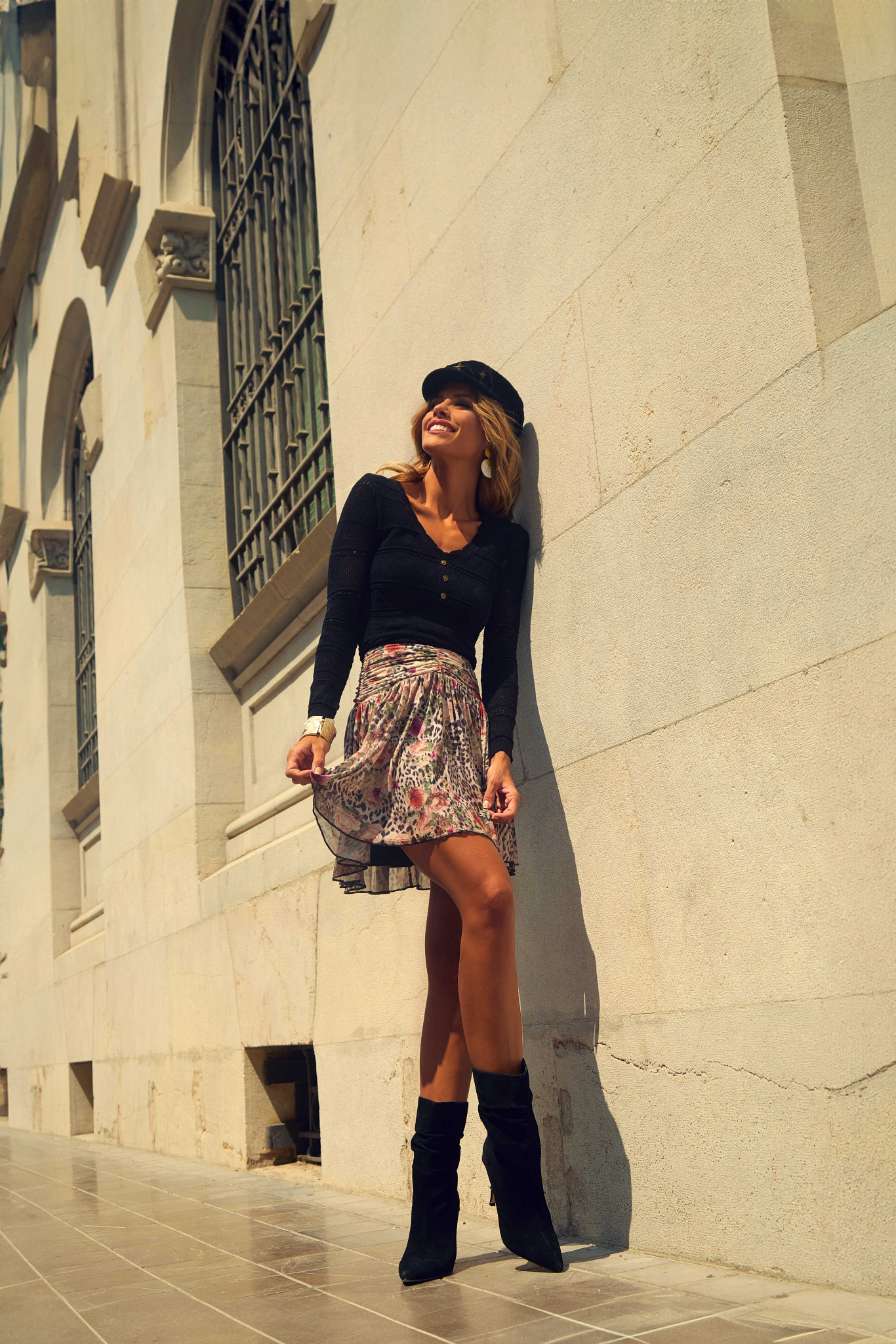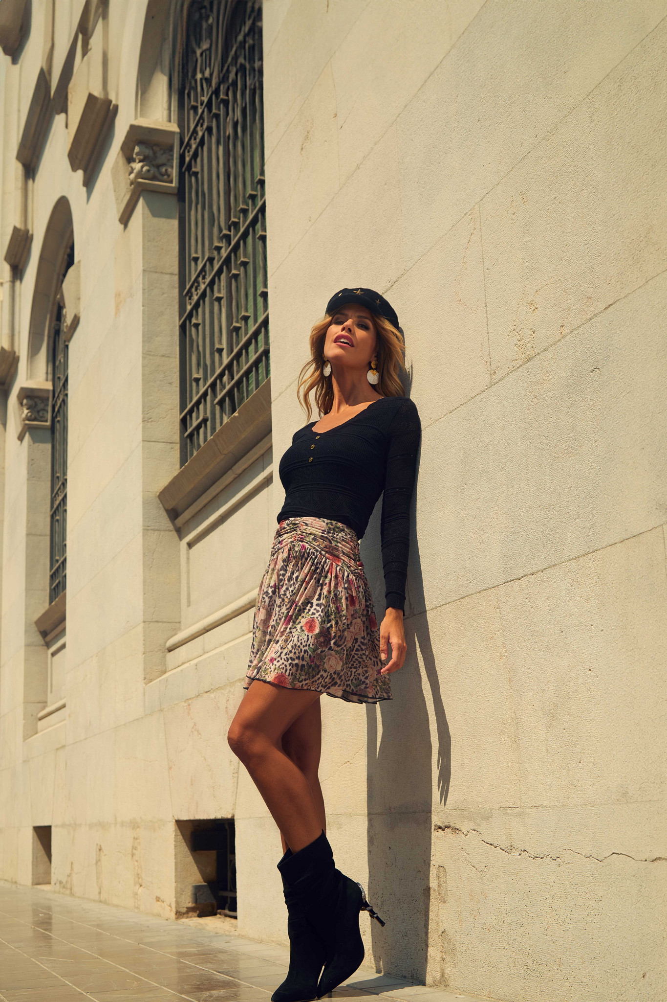 Falda corta fluida, en tejido de tul con estampado combinado de flores en colores rosas, verdes y marrones, con animal print. Lleva detalle fruncido en la parte de la cinturilla. Se cierra con cremallera dorada personalizada en la parte trasera.