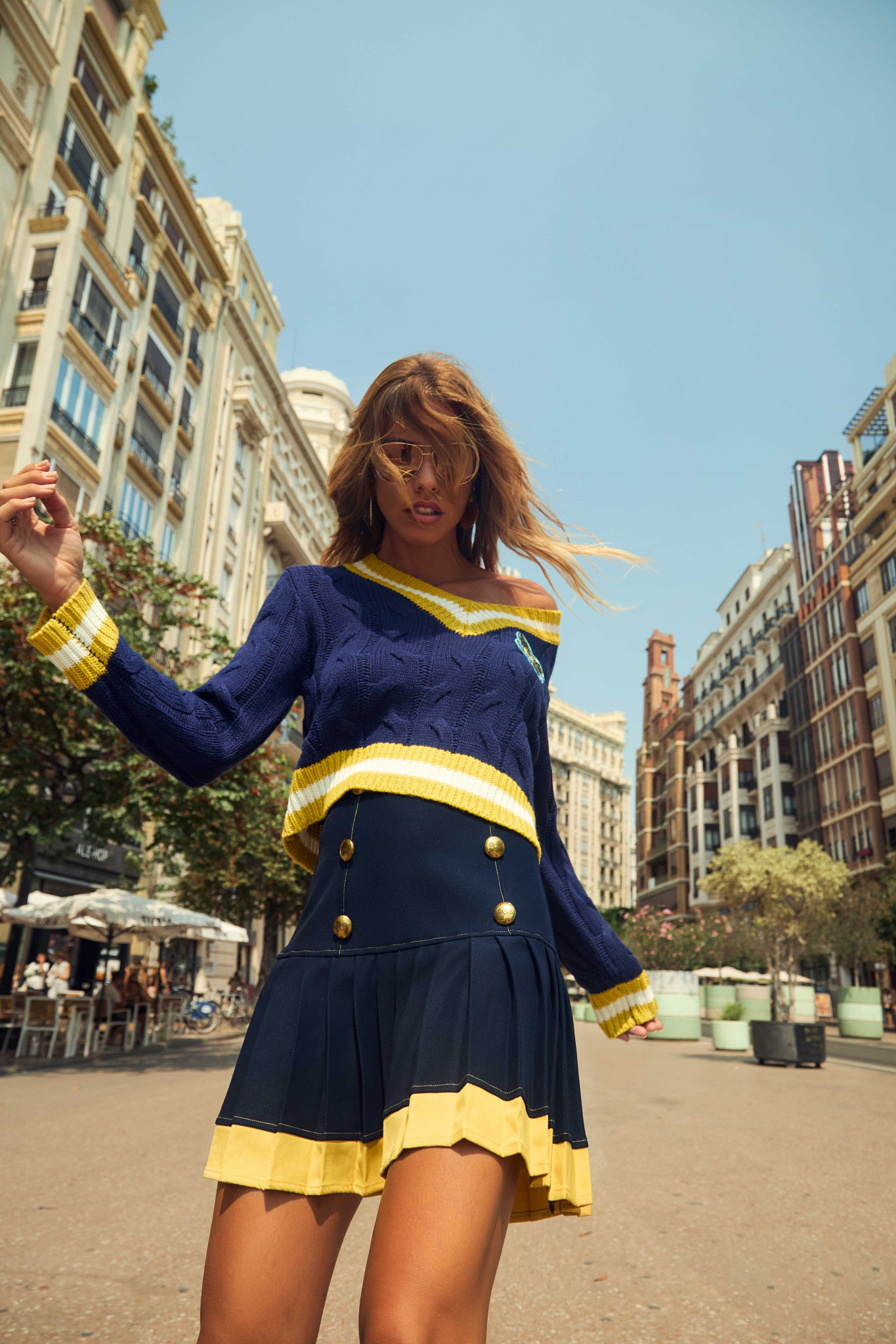Falda corta con tablas, en color azul y detalles amarillos. Hasta la parte de la cadera es entallada y a partir de ahí salen las tablas. Lleva falsos botones personalizados en dorado en la parte delantera. Se cierra con cremallera en la parte de atrás.