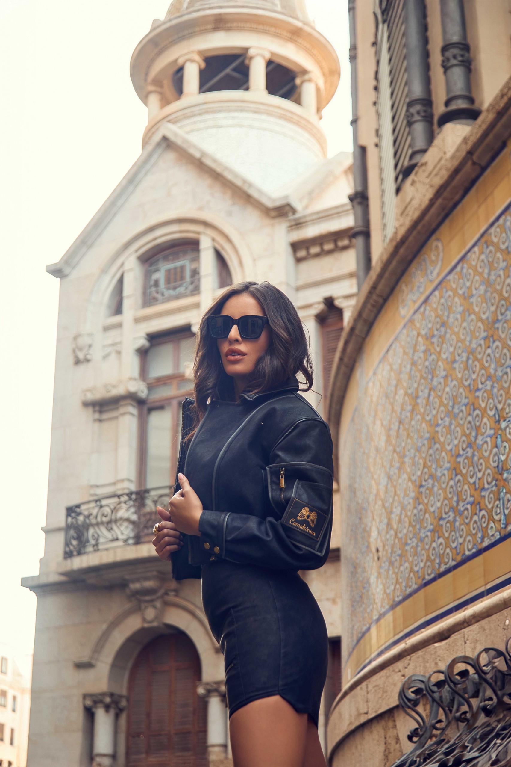 Falda de ecopiel corta asimétrica cruzada en color gris petróleo. Detalle cremallera en un lateral y logo bordado de la marca en el otro. Cierre con cremallera en la parte trasera.