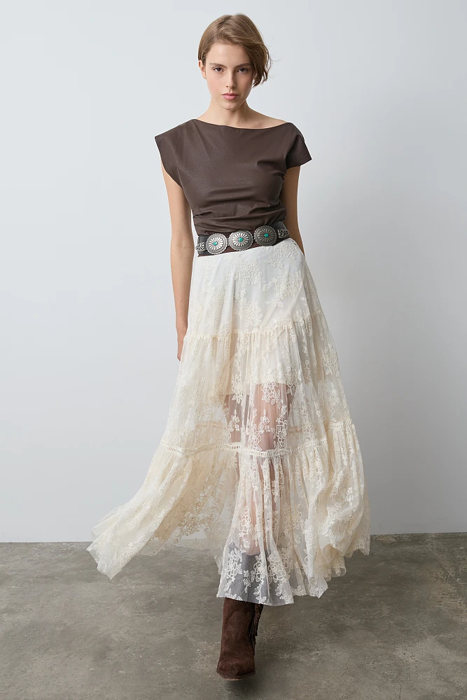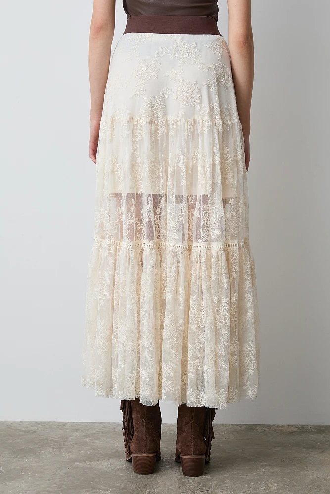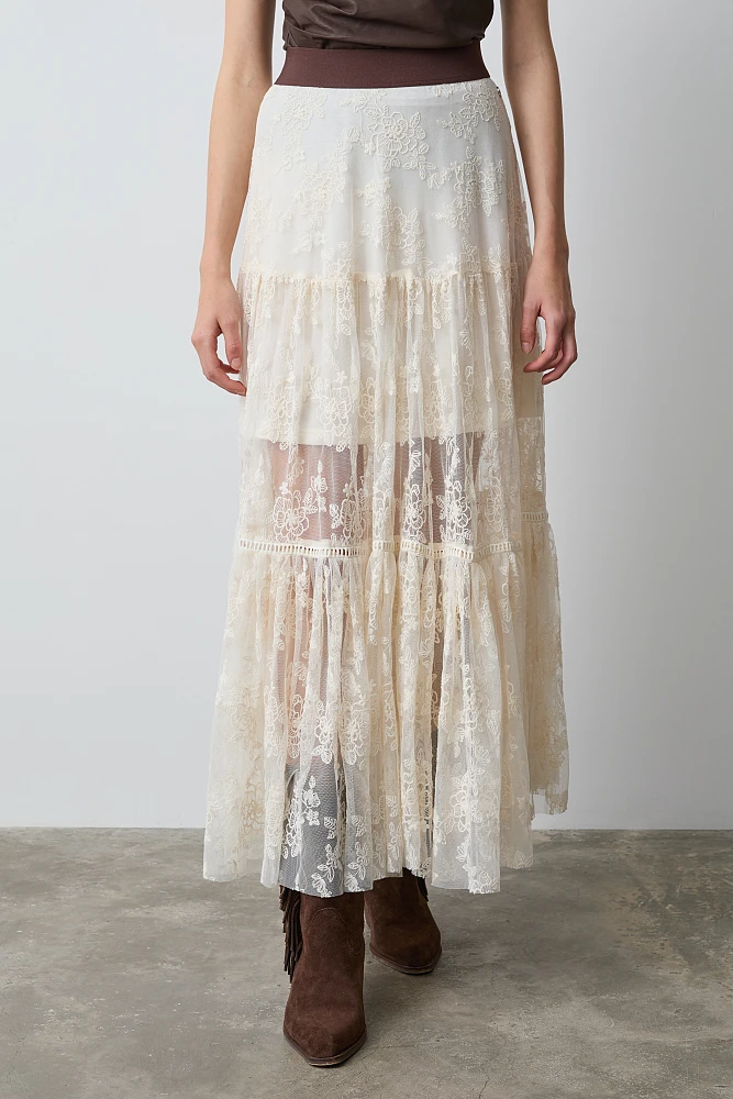 Falda larga de encaje, con cintura elástica y forro interior. semitransparente.