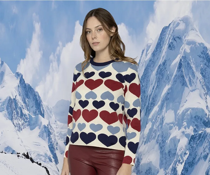 Jersey con corazones en colores azul claro, azul oscuro y granate dispuestos en líneas. Destaca por no tener ribs en mangas ni en el final, dejando que el diseño llegue hasta el borde.