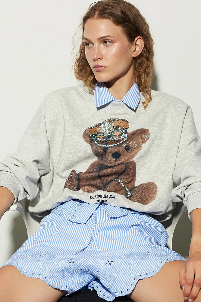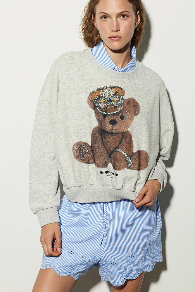 Sudadera, con mangas largas, con cuello redondo, con estampado de oso de peluche, con strass, ajuste regular.