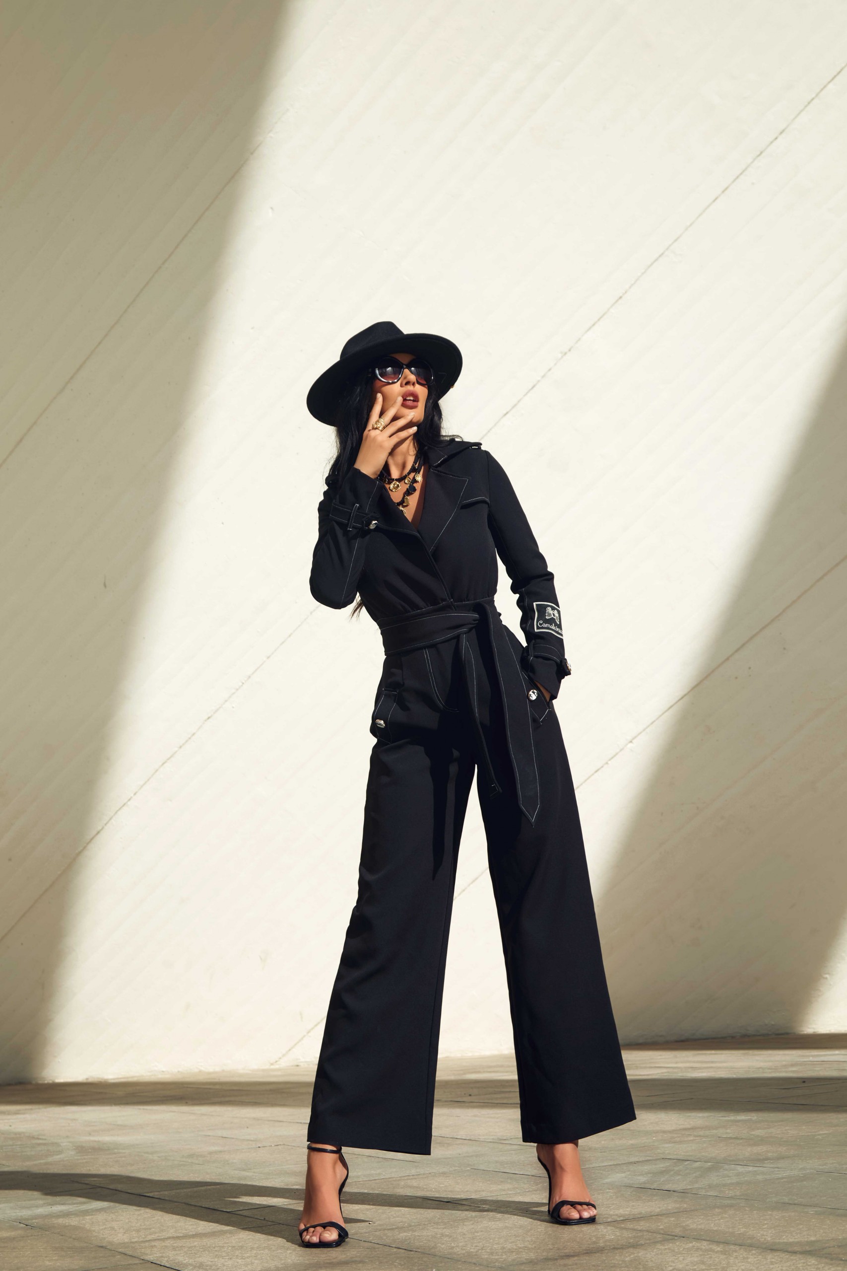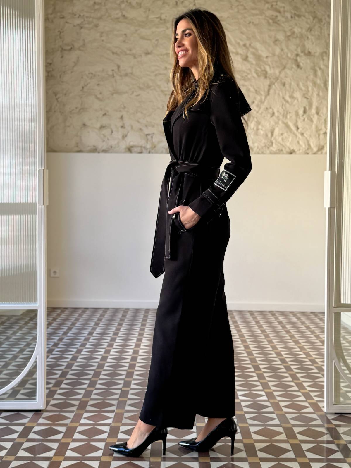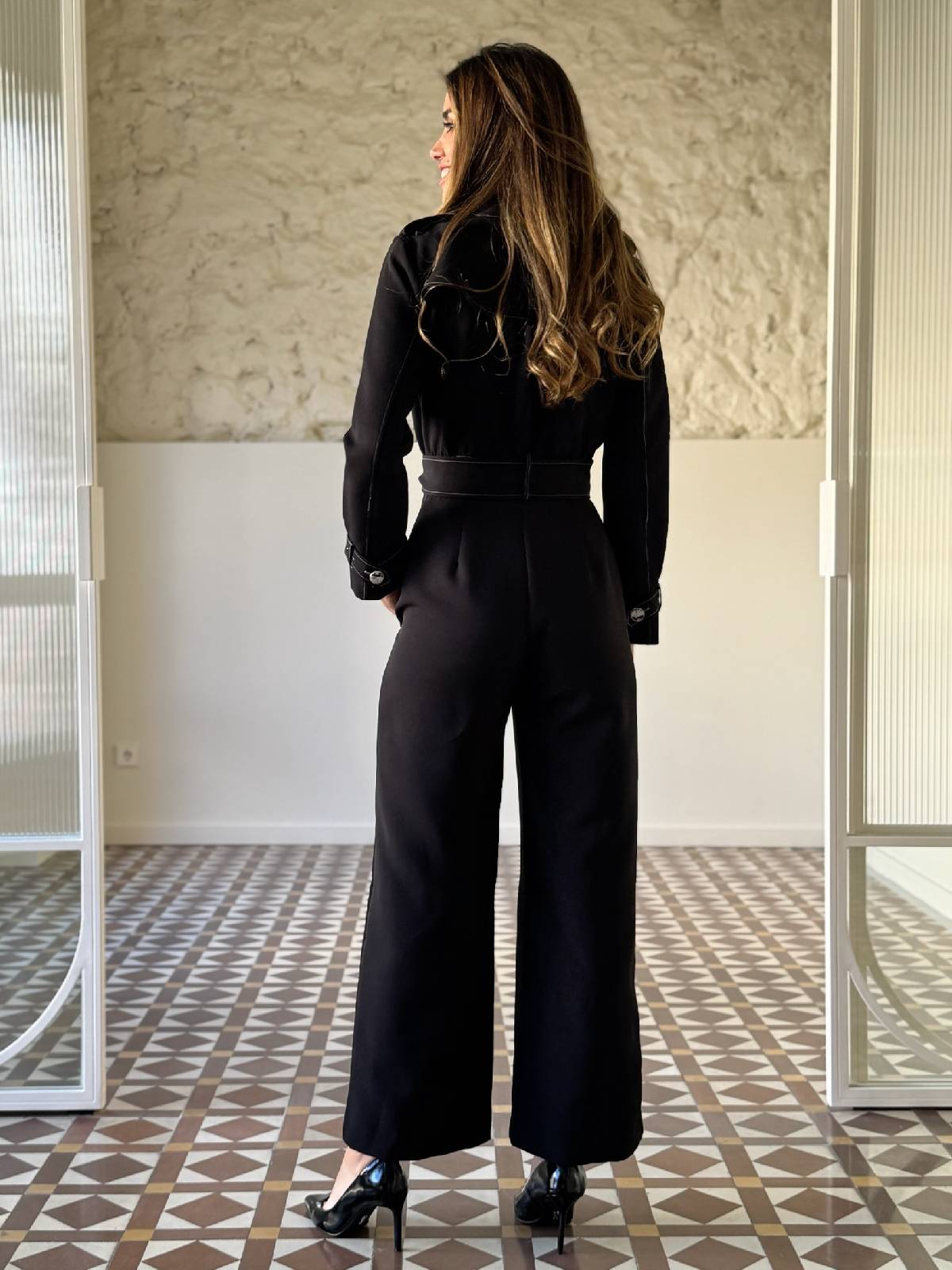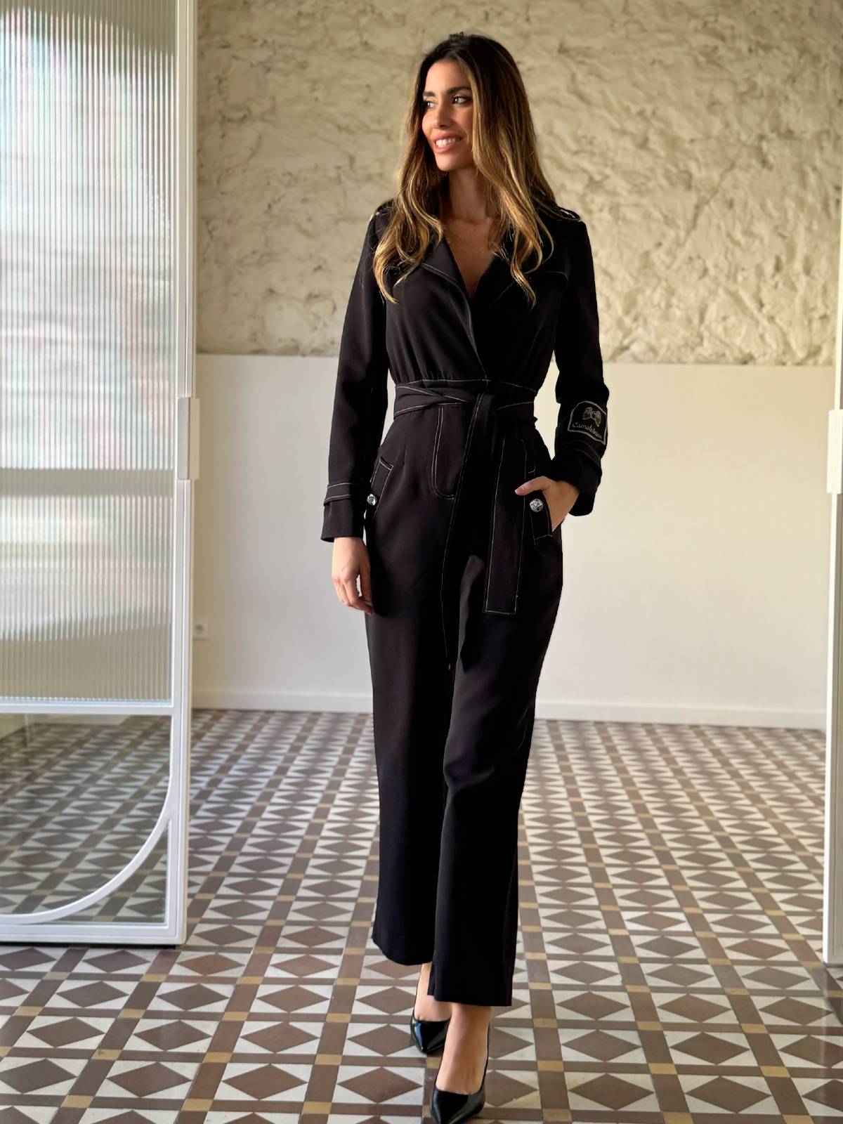 Mono casual largo en color negro con pespunte en blanco, trabillas en hombros y puños. Pequeña capa en parte superior de la espalda. Escote en pico cruzado. Cinturón atado con lazada del mismo tejido. Pantalón ancho con bolsillos laterales. Detalle botón marmolado. Logo de la marca en la manga.