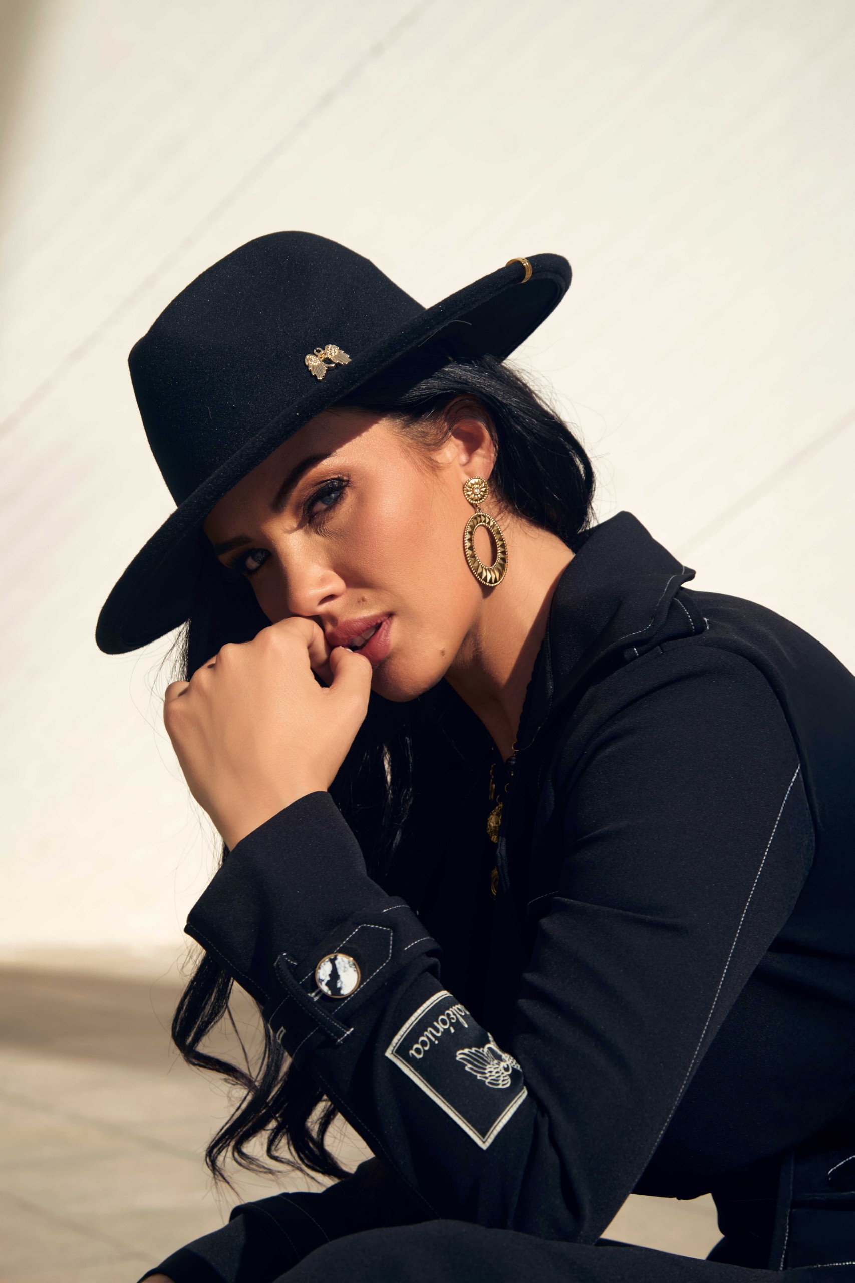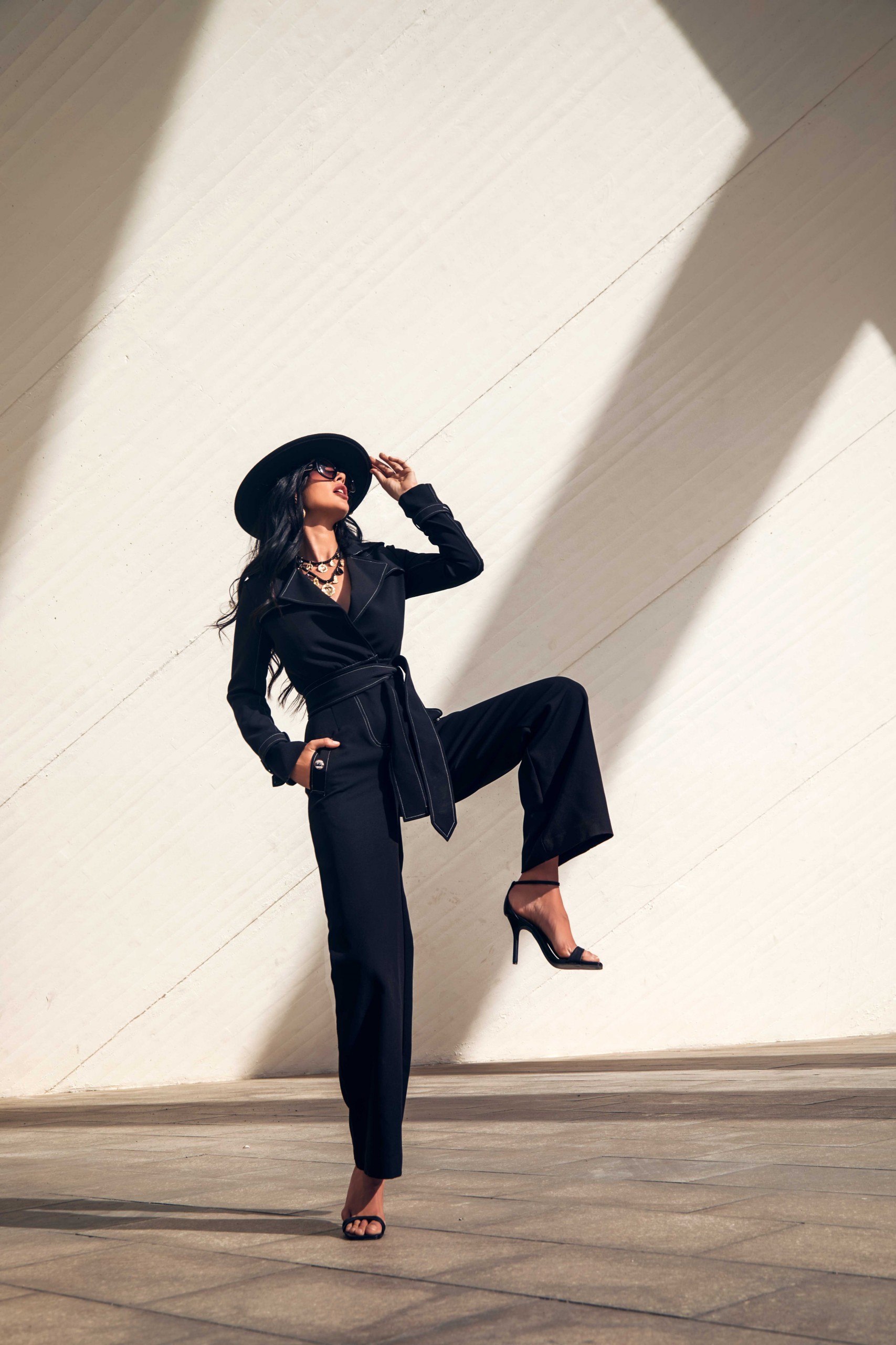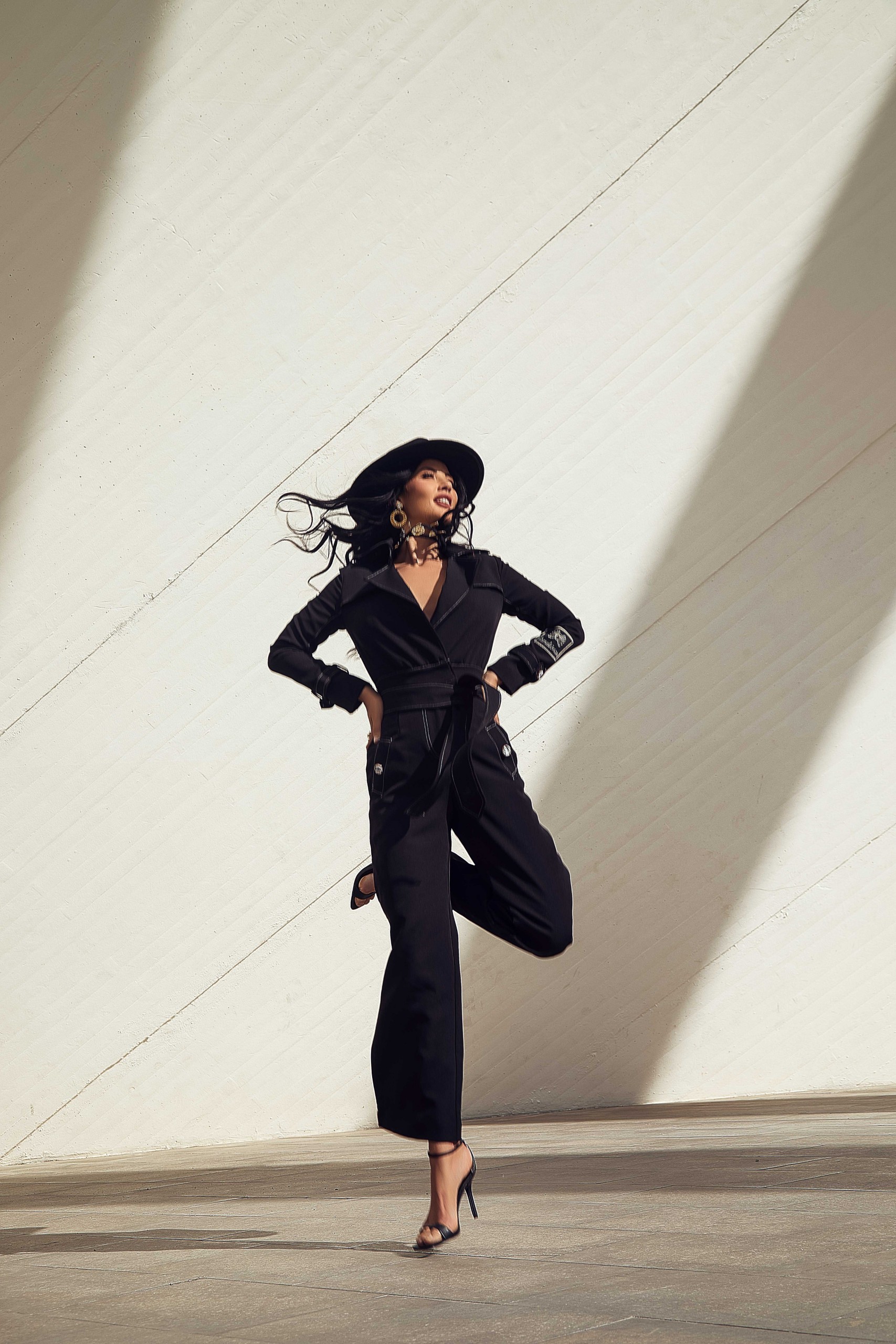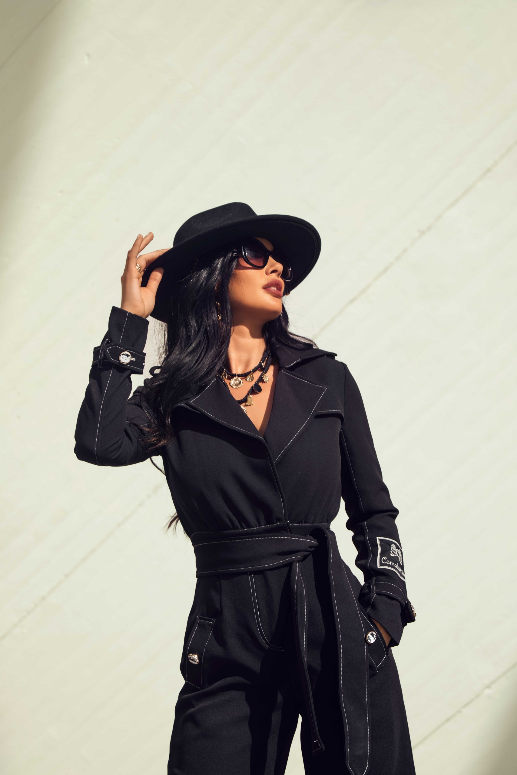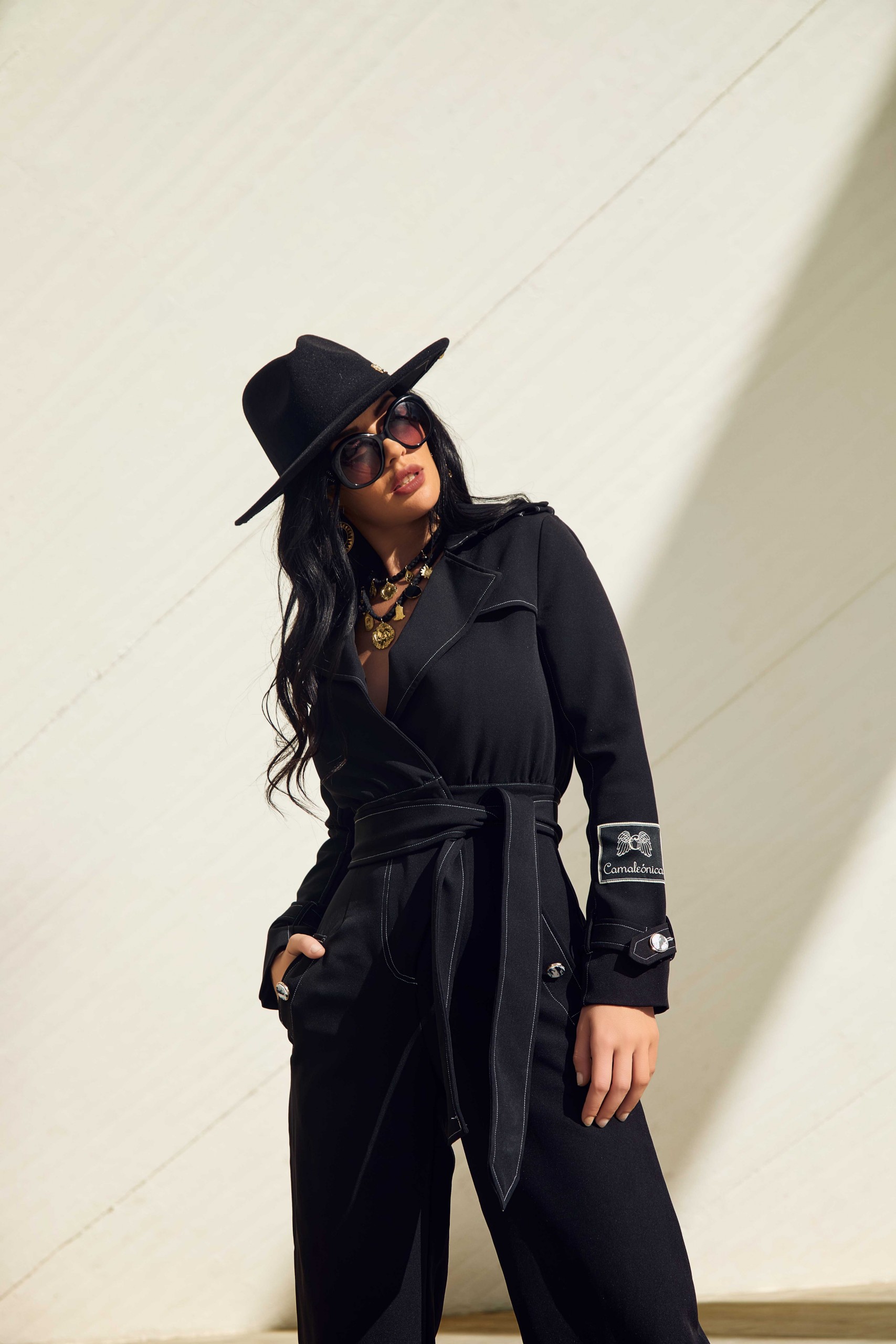 Mono casual largo en color negro con pespunte en blanco, trabillas en hombros y puños. Pequeña capa en parte superior de la espalda. Escote en pico cruzado. Cinturón atado con lazada del mismo tejido. Pantalón ancho con bolsillos laterales. Detalle botón marmolado. Logo de la marca en la manga.
