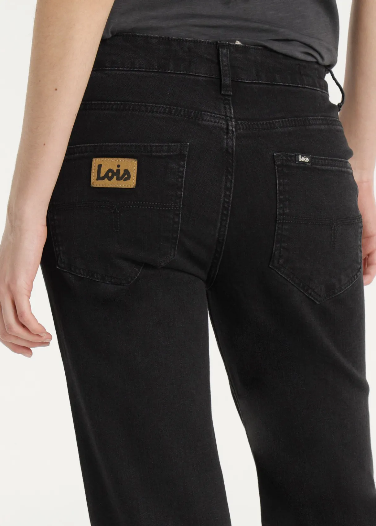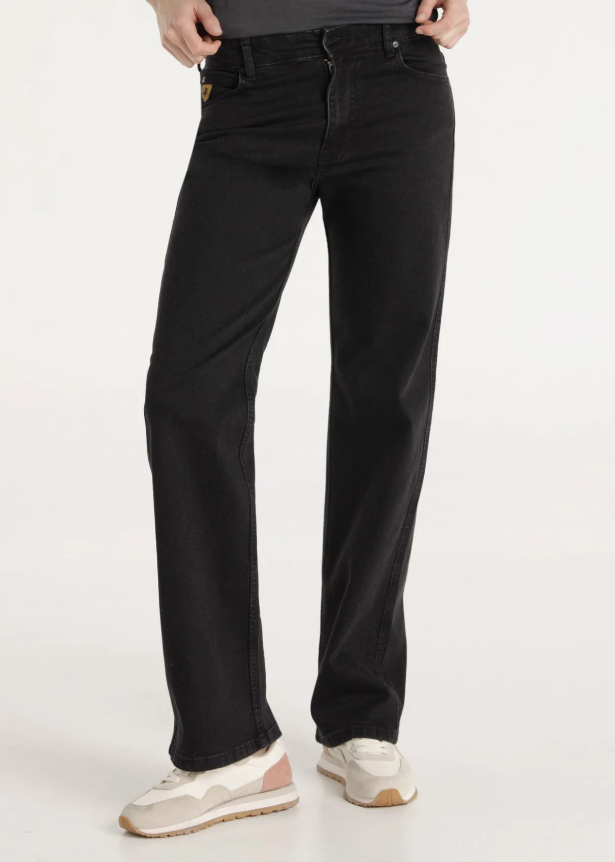Jeans de tiro medio que se asienta justo por debajo de la cintura. Confeccionados en un 98% de algodón y un 2% de elastano, ofrecen una ligera elasticidad que permite libertad de movimiento sin perder su forma. El acabado washed black les da un aspecto desgastado y versátil, ideal para combinar con diversas prendas y estilos. Su color negro los convierte en una pieza esencial y atemporal en cualquier guardarropa femenino.