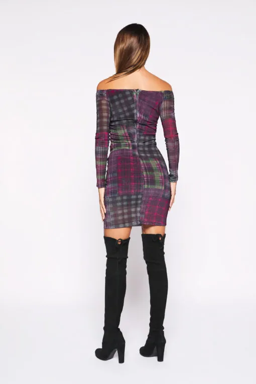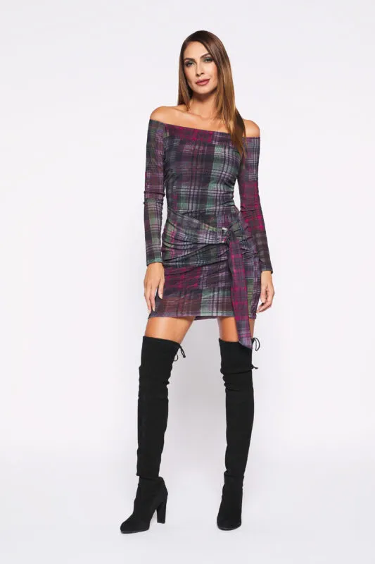 Vestido con tejido de tul velvet estampado, escote barco. Falda con fantasía drapeada y hebilla. Tiene forro interior y cremallera invisible en la espalda.