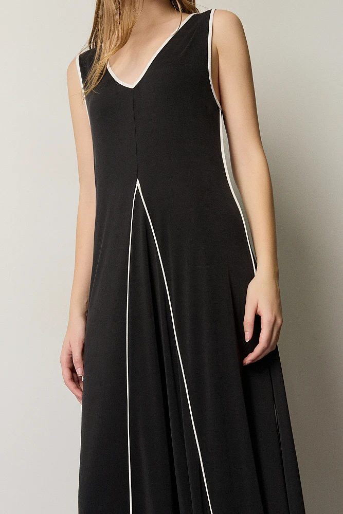 Vestido largo sin manga, con escote en pico y detalle de contrastes.