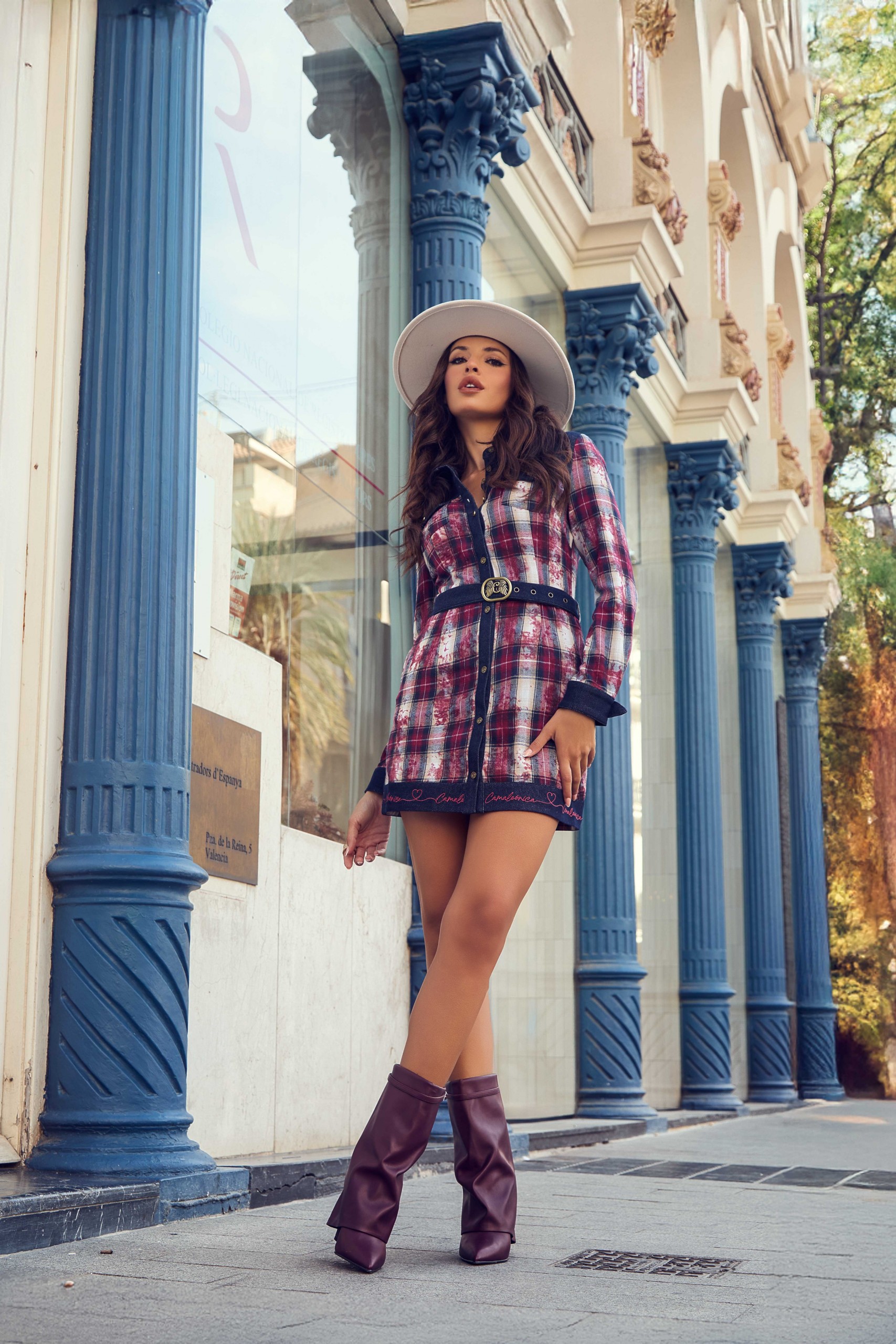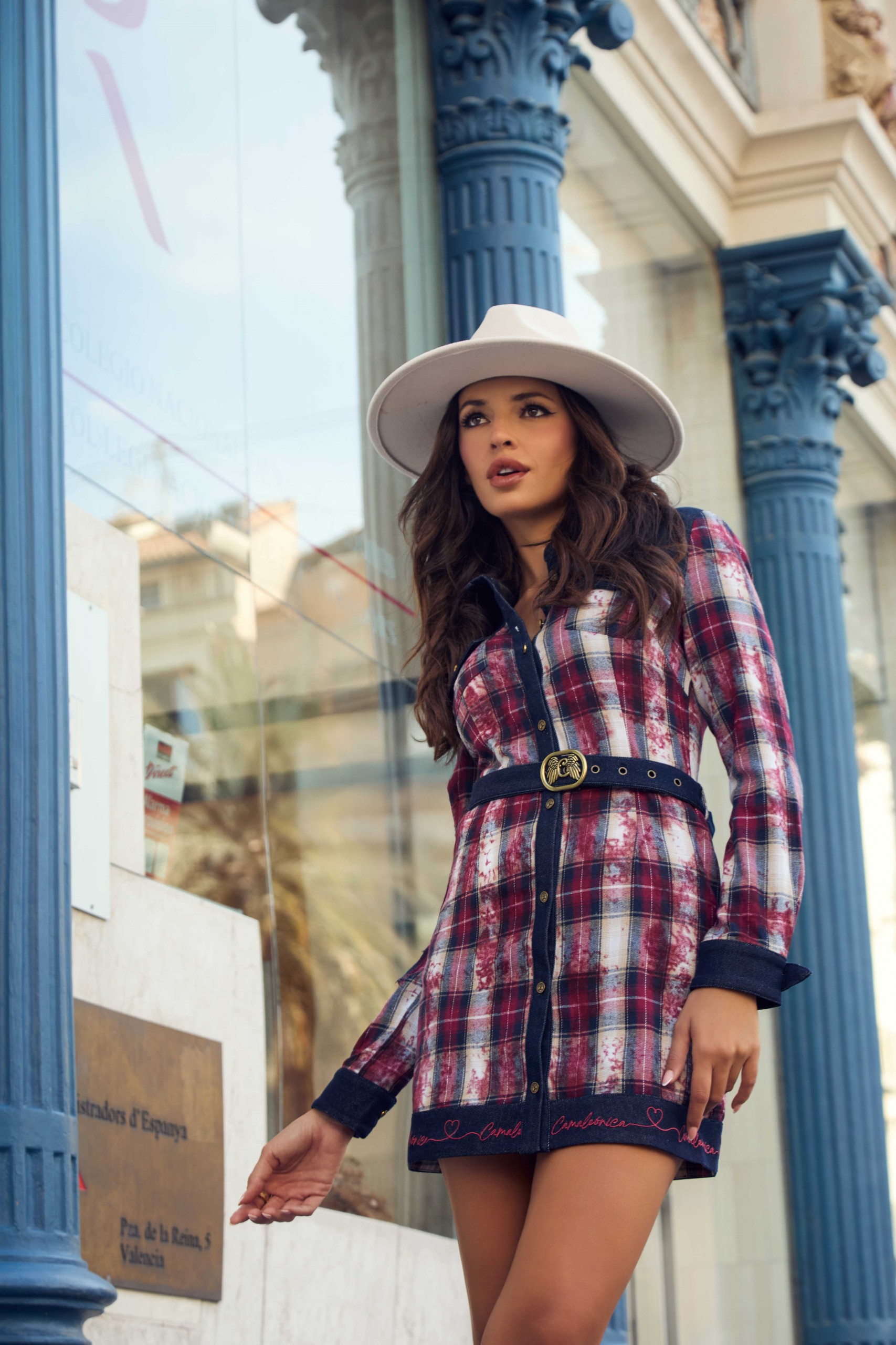 Vestido corto estilo camisero, con estampado de cuadros blanco y burdeos y contraste con detalles denim. Bordado de Camaleónica en el bajo. Botones de clip en la parte delantera. Dos bolsillos en la parte del pecho y dos bolsillos laterales. Cinturón denim con hebilla dorada con logo de Camaleónica.