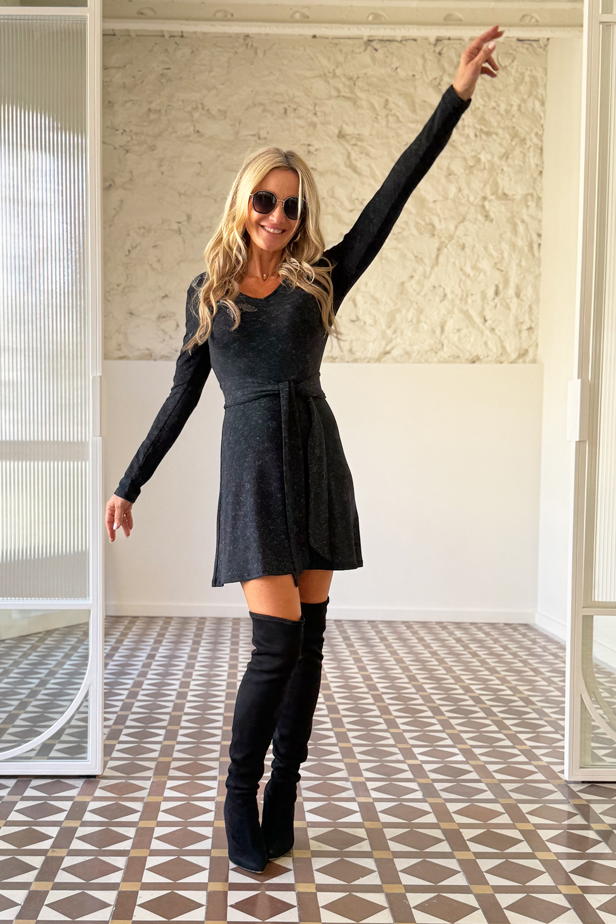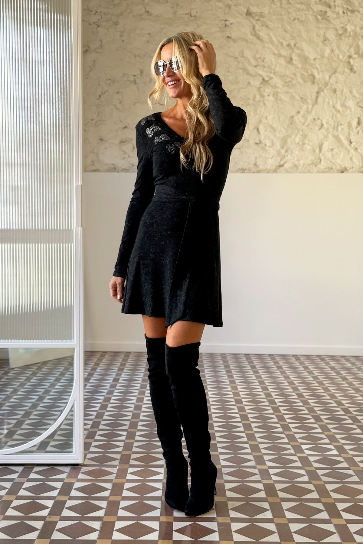 Vestido corto de manga larga con escote en pico, lazada en la cintura del mismo tejido y color. Detalle de logos de Camaleónica en la parte delantera con strass. Forro pola.