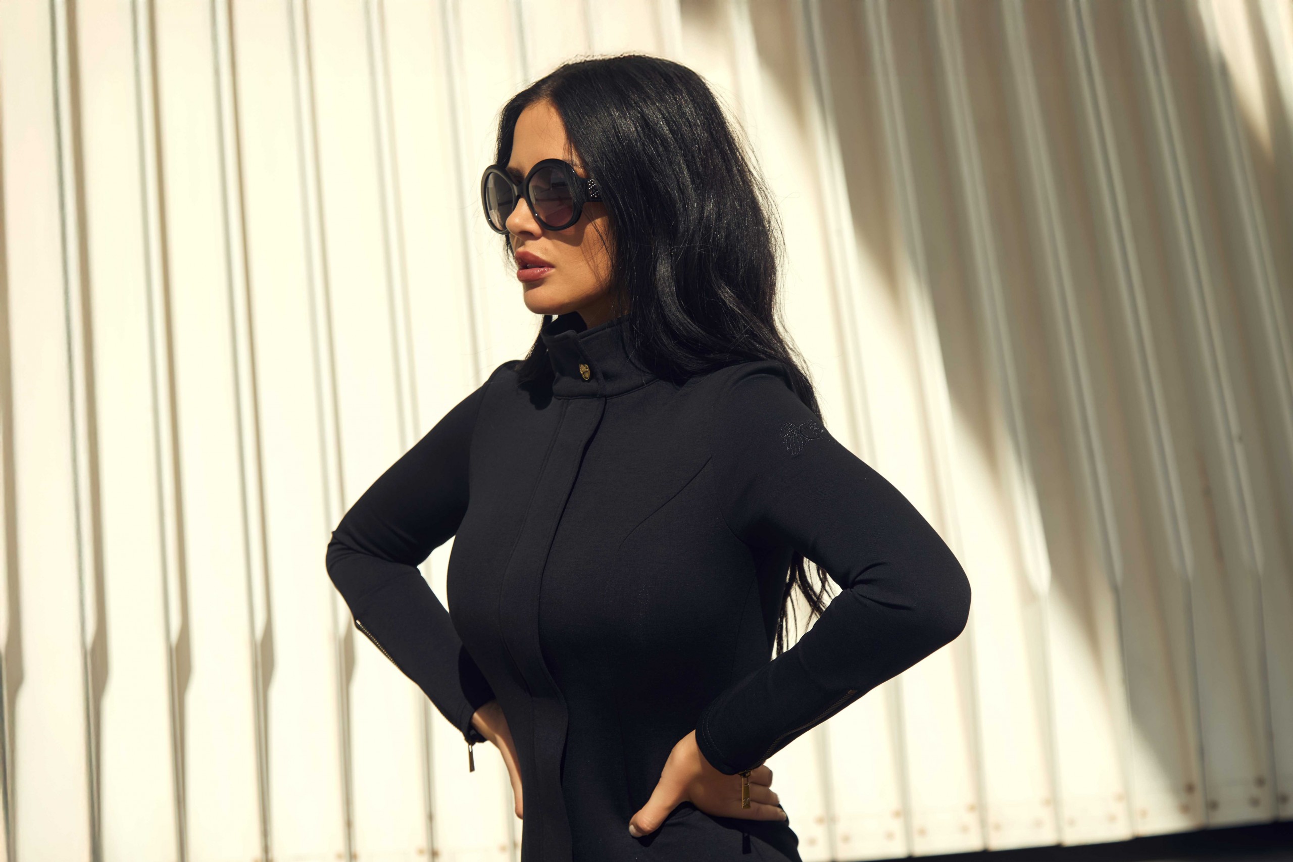 Vestido corto negro ajustado de manga larga y cuello alto con botón dorado. Cremallera central cubierta por solapa. Detalle de cremallera en las mangas. Broche de color cobre extraíble.